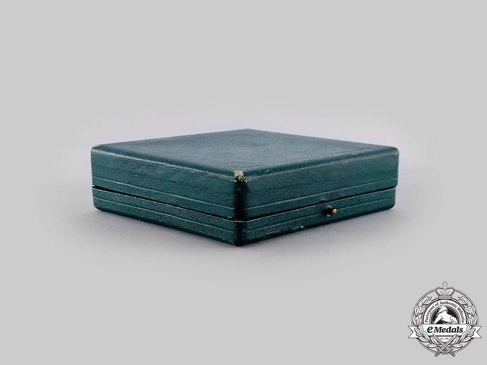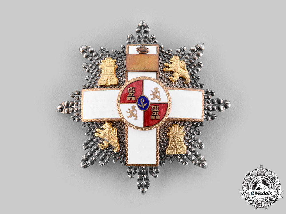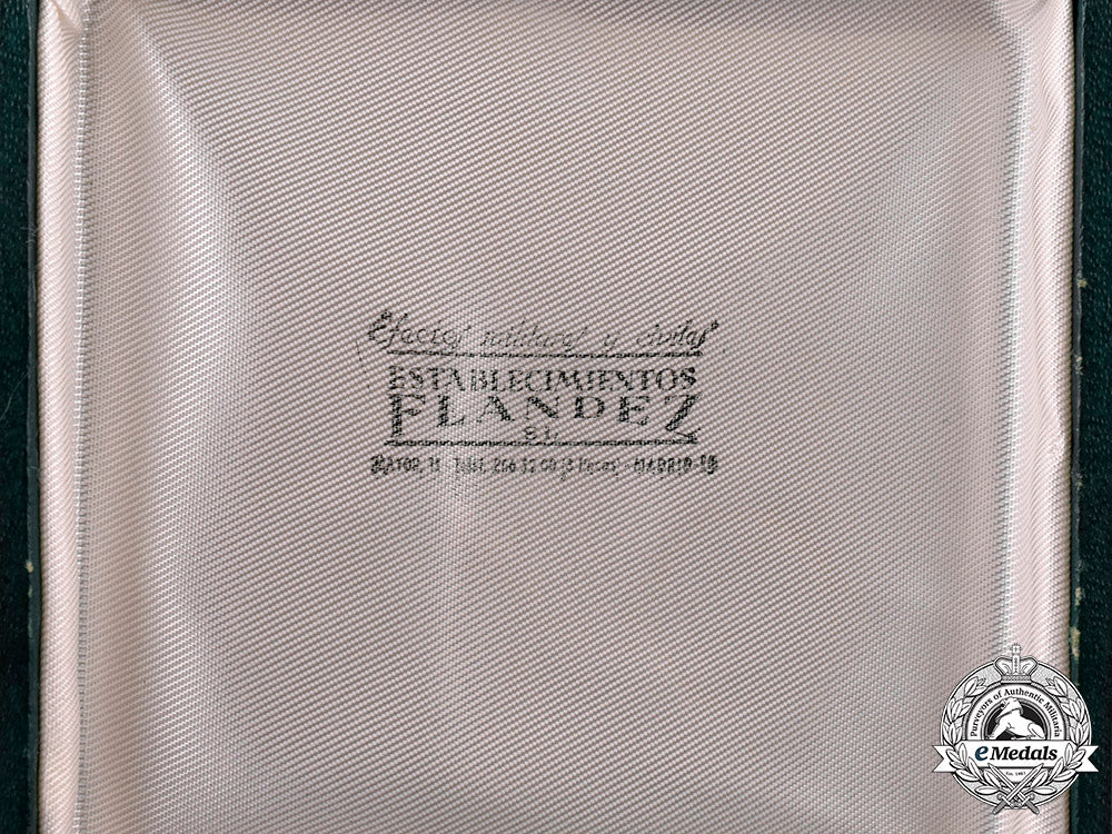 (Orden del Mérito Militar). Instituted by Queen Isabel II on August 3, 1864. A six-pointed multirayed star in silver, superimposed by a typical enameled white four-armed cross in bronze gilt, presenting gilded lions and castles alternating through the quadrant, the obverse centre depicting period Spanish coat of arms in enamels, 12 o’clock arms with a gilded clasp surmounted by a period Spanish crown, reverse with pin assembly flanked by two stays, measuring 62.47 mm (w) x 62.42 mm (h), minor toned silver and stained white enamels, extremely good condition. Accompanied by a miniature consisting of a six-pointed multirayed star in silver, superimposed by a gilded enameled white four-armed cross with a period central Spanish coat of arms in enamels, presenting gilded lions and castles in each quadrant, 12 o’clock arms also with a gilded clasp and a Spanish crown, reverse with button hole for attachment, measuring 20.82 mm (w) x 20.42 mm (h), tarnished silver, extremely good. The set is contained by a hard-shelled green case with gilded ornamented frame, the interior lid is in white-cream silk inscribed by the maker’s name, with recessed black medal bed in cotton, measuring 104 mm (w) x 28 mm (h) x 104 mm (l), presenting minor wearing surface, functional push-button, good condition.