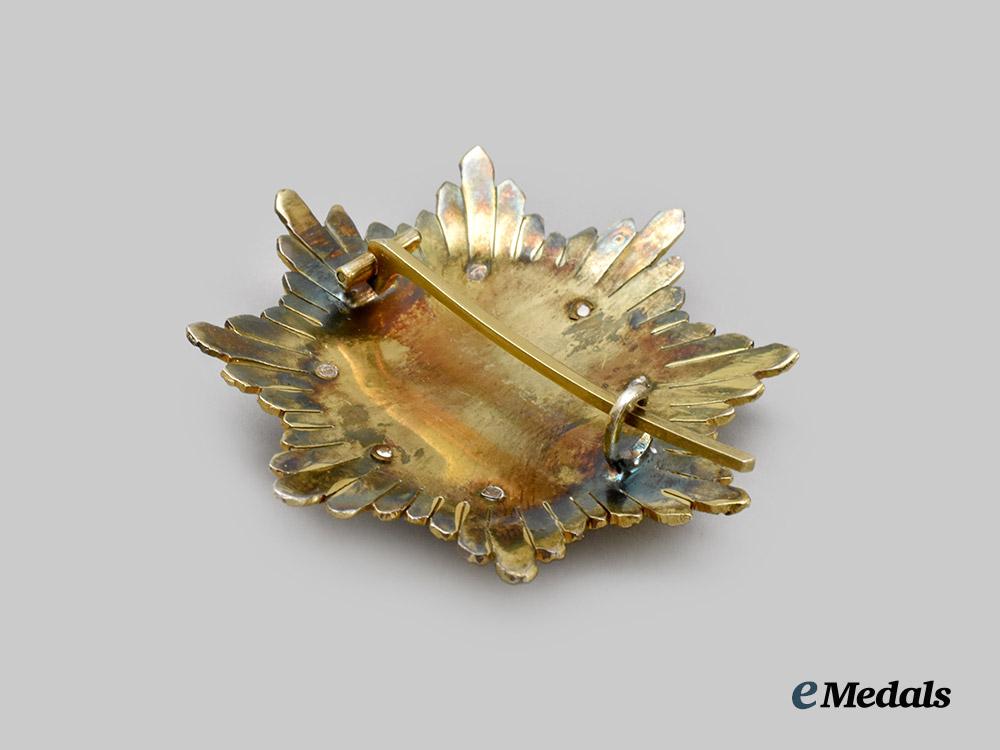 (Cruces del Mérito Militar). Instituted August 3rd, 1864. (c. 1940 issue). Type VI. An eight-pointed gilded bronze multi faceted star with a large white enameled gilded Greek Cross with silvered rampant lions and castle towers in the quadrants between the arms of the cross, the obverse with a central enameled the obverse with a central emblem bearing the coat of arms of Castile, León, Aragon, Navarre, and Granada, topped by a gilt bar to bear the date of bestowal (blank) topped by a Royal Crown, the reverse is plain, with a functional vertical pinback, unmarked, measuring 60.7 mm (w) x 60.6 mm (l), weighing 39.11 grams, in near extremely fine condition.