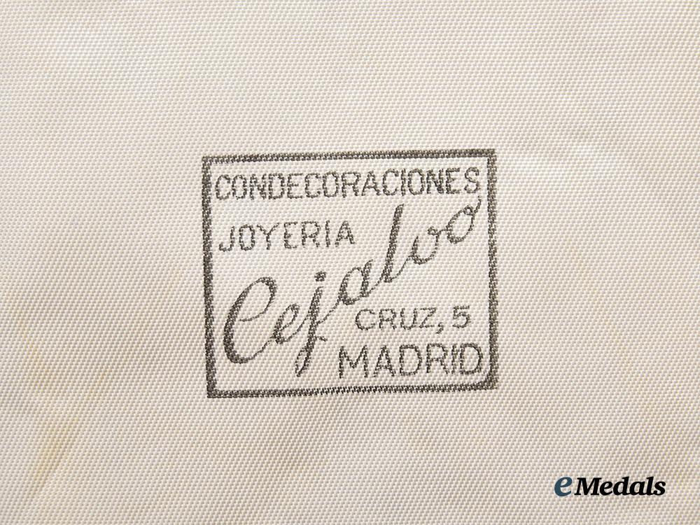 Contained in its original case of issue, a hardshell brown leatherette exterior with superimposed Spanish coat of arms insignia, the interior silk lid denoting manufacture by Cejalvo, a black velvet removable medalbed, measures 115 mm (w) x 150 mm (l) x 35 mm (d), functioning hinge and clasp, light wear, in extremely fine condition.