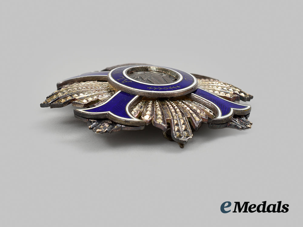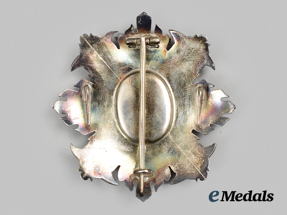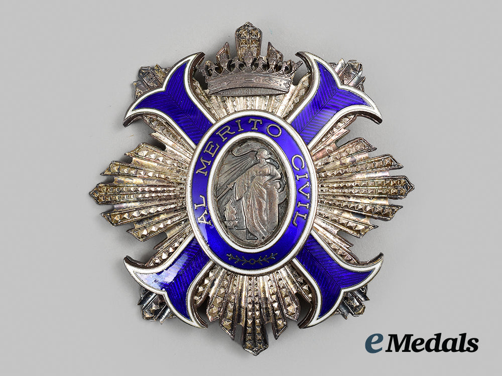 (Orden al Mérito Civil). Instituted by King Alfonso XIII on June 25, 1926. 1940-1975 Issue. In silver, a multirayed eight-pointed star with beaded arms, the obverse is superposed by a blue-enameled white-edged four-armed cross also in silver, featuring the central inscription AL MERITO CIVIL (To Civil Merit), the cross is surmounted by a period Imperial crown also in silver, the reverse with principal pin assembly flanked by two stays, measuring at 67.15 mm (w) x 69.70 mm (h) and weighing in at 60.0 grams, very fine.
