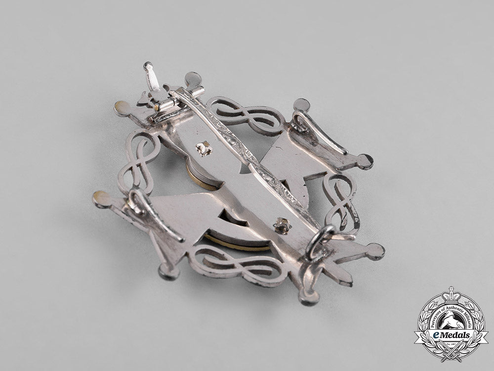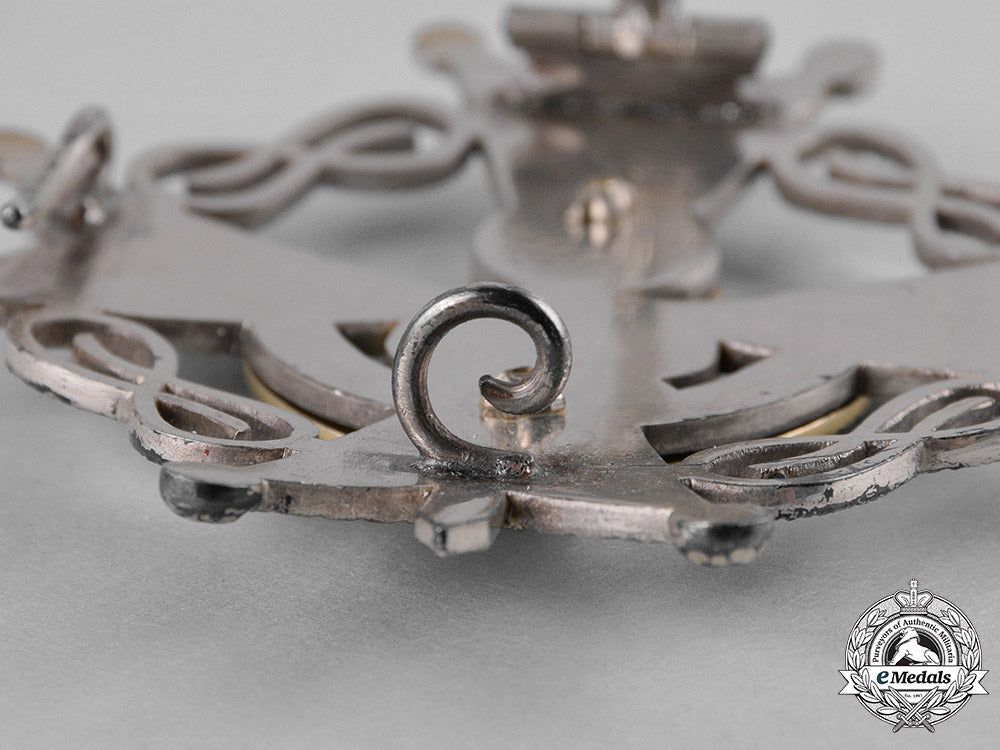 (Orden de la Cruz de San Raimundo de Peñafort). Instituted 1944 by General Francisco Franco. 1944-present issue. A ball-tipped enameled white Maltese Cross in silvered bronze, featuring the inscription S RAYMUNDUS / PENNAFORTI (St. Raymond of Peñafort) on the 12 o’clock and 6 o’clock arms, surrounded by a crossed laces in each quadrant also in silvered bronze, obverse depicting an enameled red, blue, yellow, and orange figure of St. Peñafort, with beneath enameled blue ribbon inscribed by Latin inscription IN JURE MERITA, reverse with ornament pin assembly and dual stays, measuring 66.68 mm (w) x 74.89 mm (h across sword), with minor tarnished silvered bronze, very fine.
