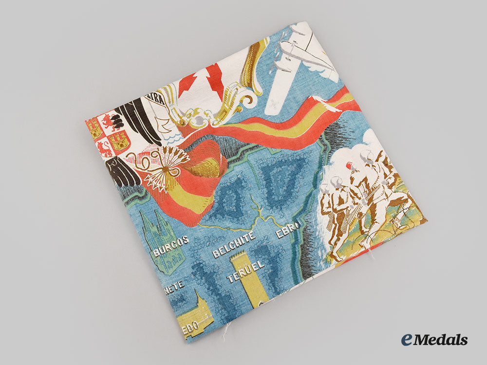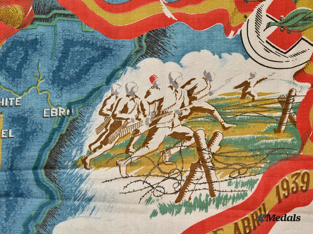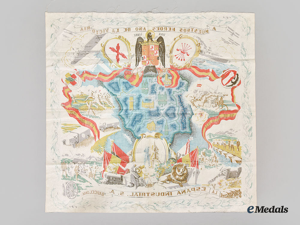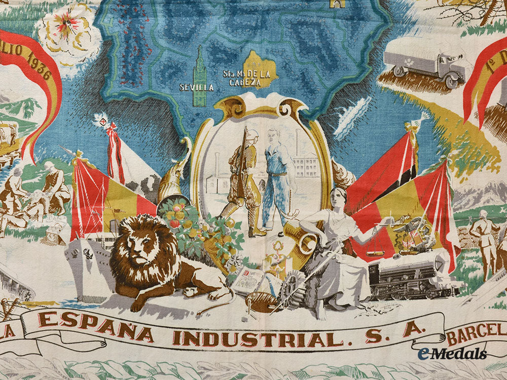 A large cloth wall hanging in a watercolour-esque style in full colour, the top banner reads A NUESTROS HEROES ANO DE LA VICTORIA, the Spanish coat of arms sits below with symbols of the republic on each side, the center of presents a large map of Spain with the key cities identified, around the exterior representations of the armed forces including navy, air force, cavalry, infantry, armoured vehicles, red cross and labourers are clearly identified, the date 18 De JULIO 1936 on the left and 1 DE ABRIL 1939 on the right, the bottom banner reads LA ESPANA INDUSTRIAL. S.A. BARCELONA, a border of green and grey entwined wreath encircles the central art, the colour has bled through to the back, measures 75cm (w) x 73.5cm (h), fraying along the top and bottom, light discolouration to the edges and creases throughout, remains in near extremely fine condition.