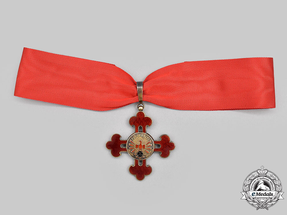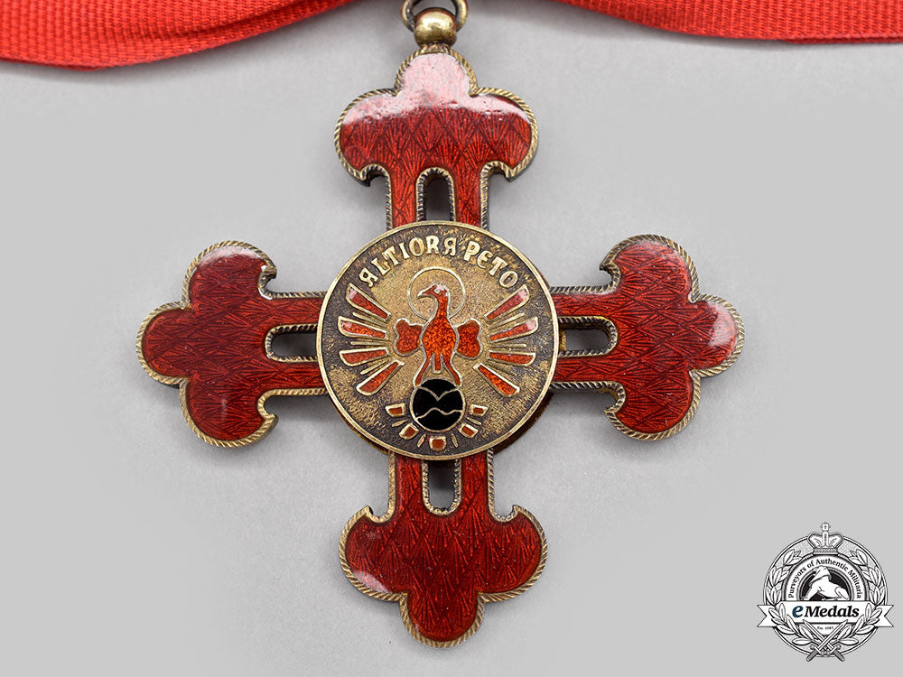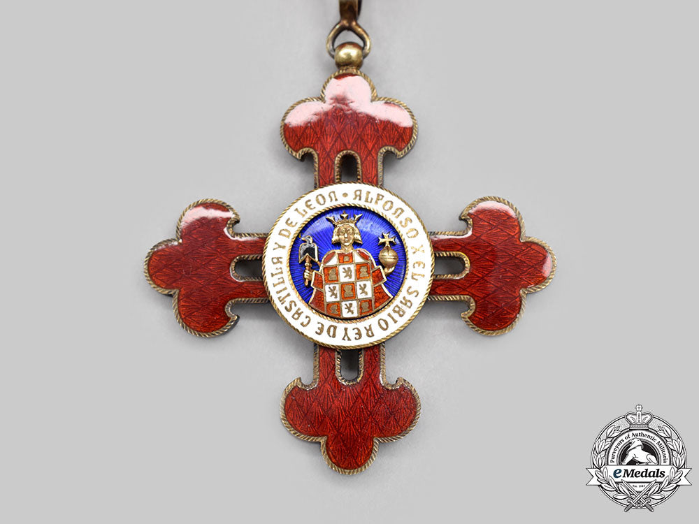 (Orden Civil de Alfonso X el Sabio). Instituted in 1939. Multi-piece construction, in silver gilt with red, white, blue and black enamels, unmarked, measuring 57.2 mm (w) x 61.2 mm (h) inclusive of its laterally-pierced ball suspension, with suspension loop, intact enamels, on a replacement full-length neck ribbon, extremely fine.