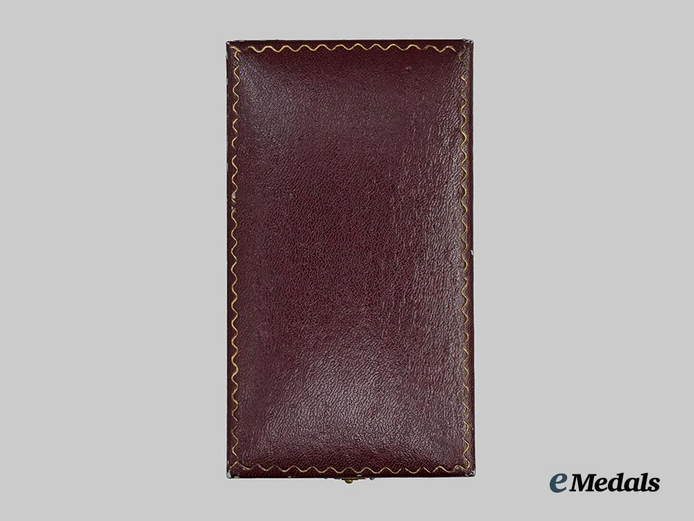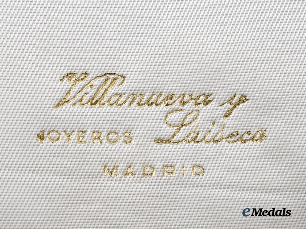 Contained in its original case of issue, in red leatherette, the interior lid marked Villanueva u JOYEROS Laiseco MADRID, black velvet removable medalbed with storage below for the cord, measures 80 mm (w) x 140 mm (l) x 43 mm (d), functional clasp, in extremely fine condition.