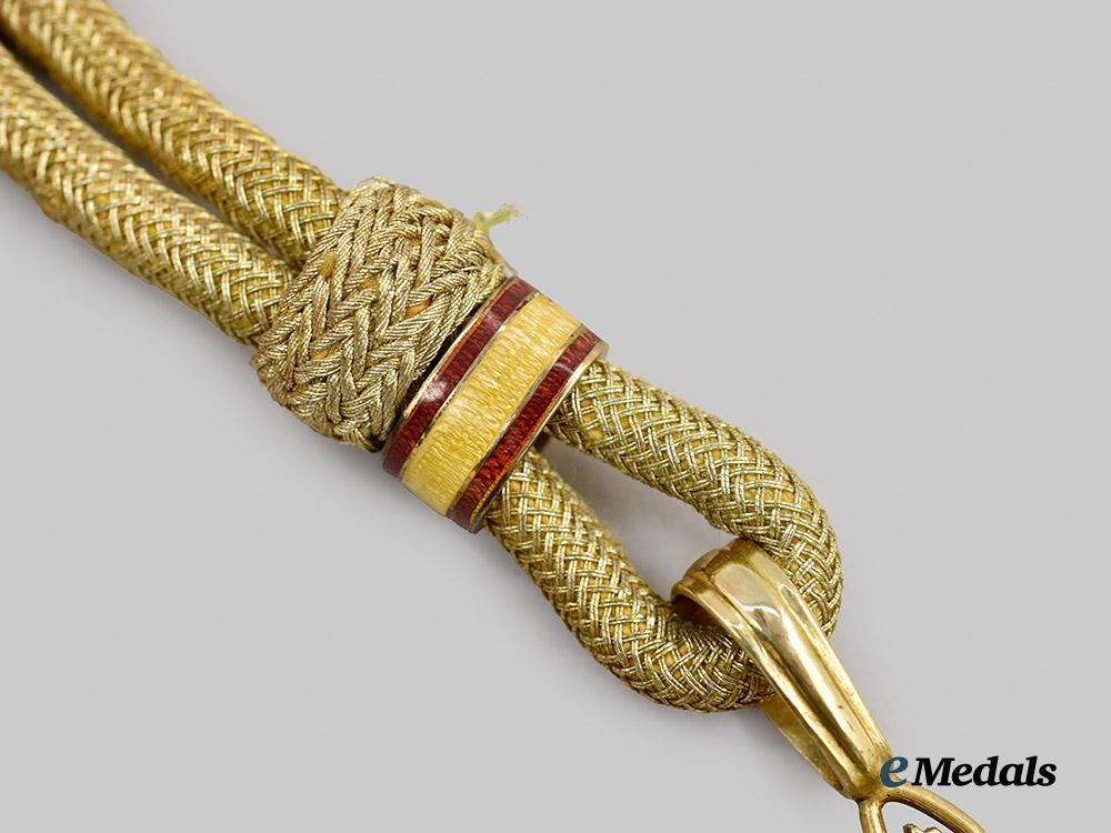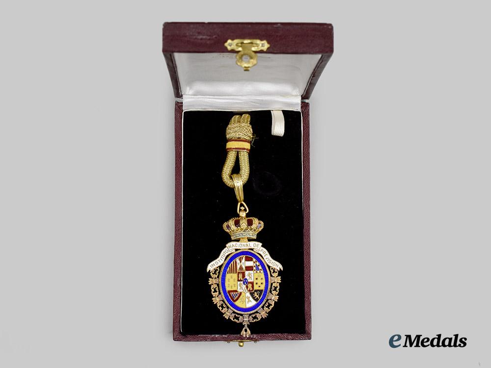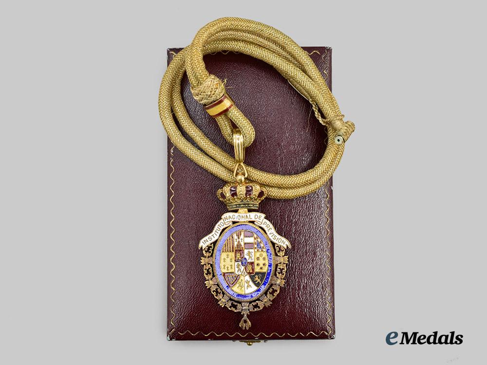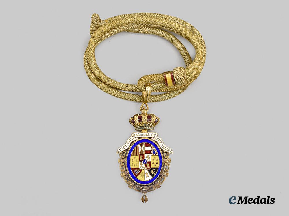 In silver gilt, an ovular decoration in multi-coloured enamels depicting spanish emblems, encircled by the collar and badge of the Golden Fleece, the white enamel pendilia read INSTITUTO NACIONAL DE PREVISION, the reverse features a blue enamel field with the inscription LEY DE XXVII DE FEBRERO DE MCMVIII, surmounted by a crown with red enamels depicting the interior cap, the badge is worn on a thick cord with a hook and eye closure, the badge measures 42.9 mm (w) x 74.3 mm (h), enamels intact, slight wear to cord, in extremely fine condition.