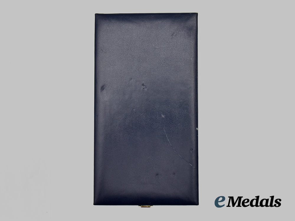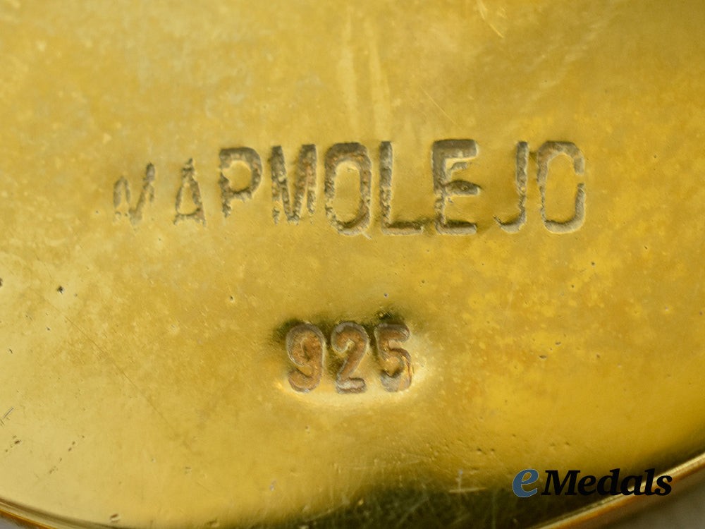 (Medalla de Oro al Mérito en las Bellas Artes). Neck Badge: multi-piece construction, in silver gilt with blue and white enamels, along with twenty-four synthetic green stones, maker marked "MARMOLE JO" and marked "925" (silver) on the reverse, measuring 50.5 mm (w) x 68.5 mm (h), on its original full-length neck ribbon; Breast Badge: multi-piece construction, in silver gilt with blue and white enamels, along with twenty-two synthetic green stones, measuring 58.5 mm (w) x 74.5 mm (h), vertical pinback flanked by dual stays; and Lapel Badge: two-piece construction, in silver gilt with blue enamels, measuring 18.2 mm (w) x 22 mm (h), pinback. Intact enamels and stones, near extremely fine. In their hardshelled case of issue, navy blue exterior, label marked "PLATA 1a LEY" on the white nylon inside lid, medal bed with an insert in maroon felt, measuring 113 mm (w) x 210 mm (h) x 37.5 mm (h), indents evident on the exterior, case better than very fine.