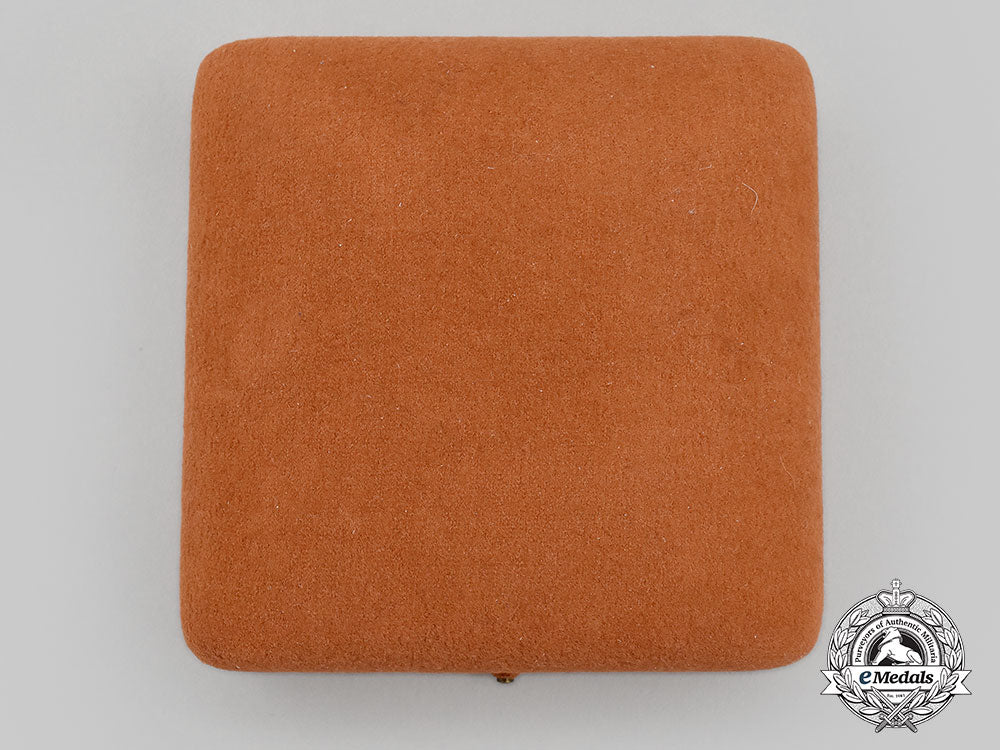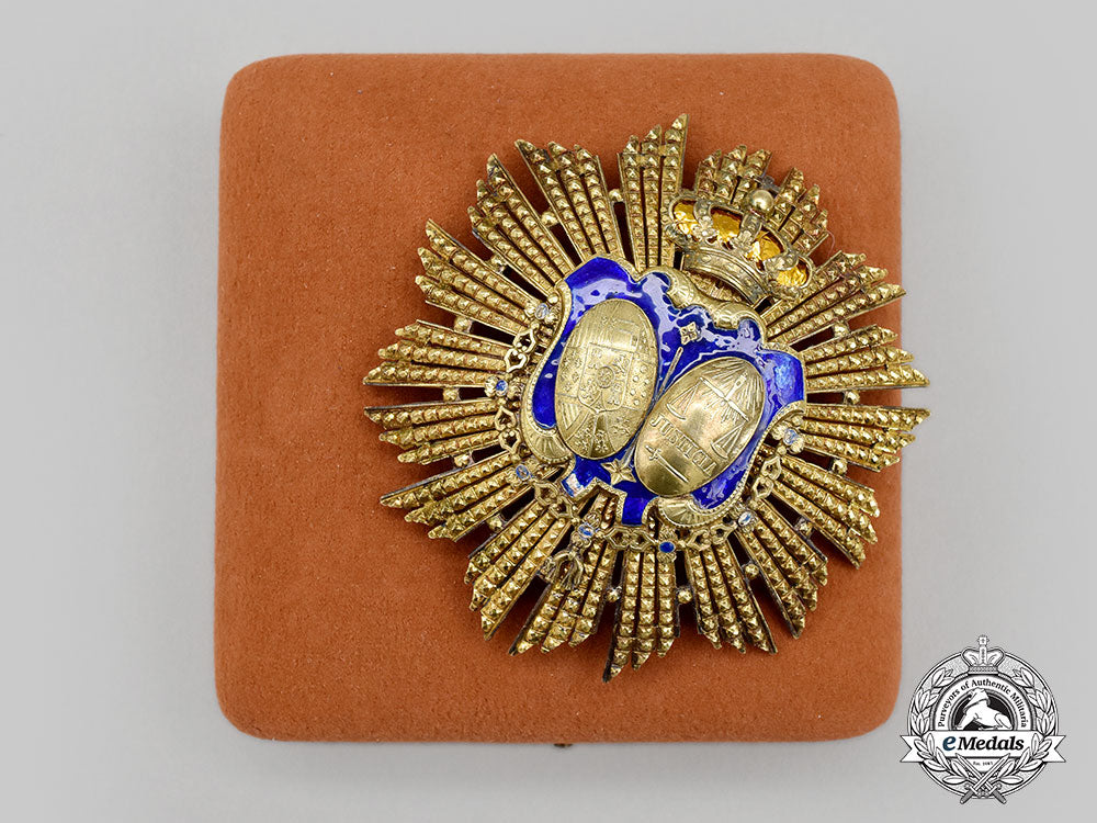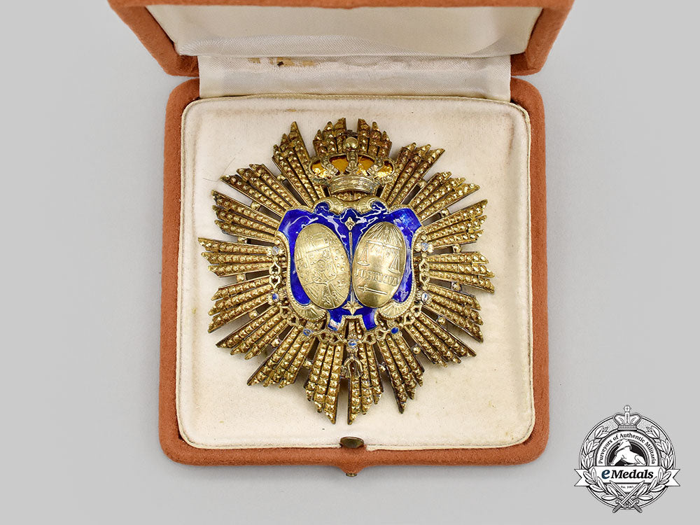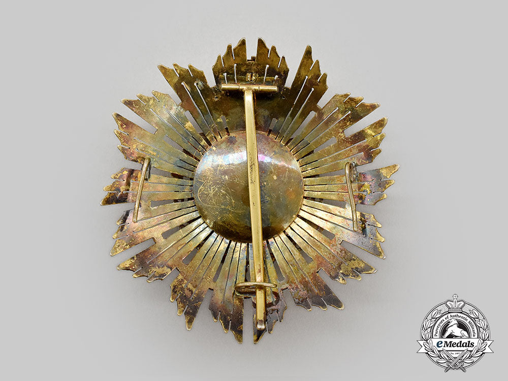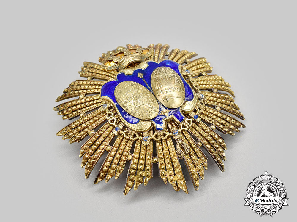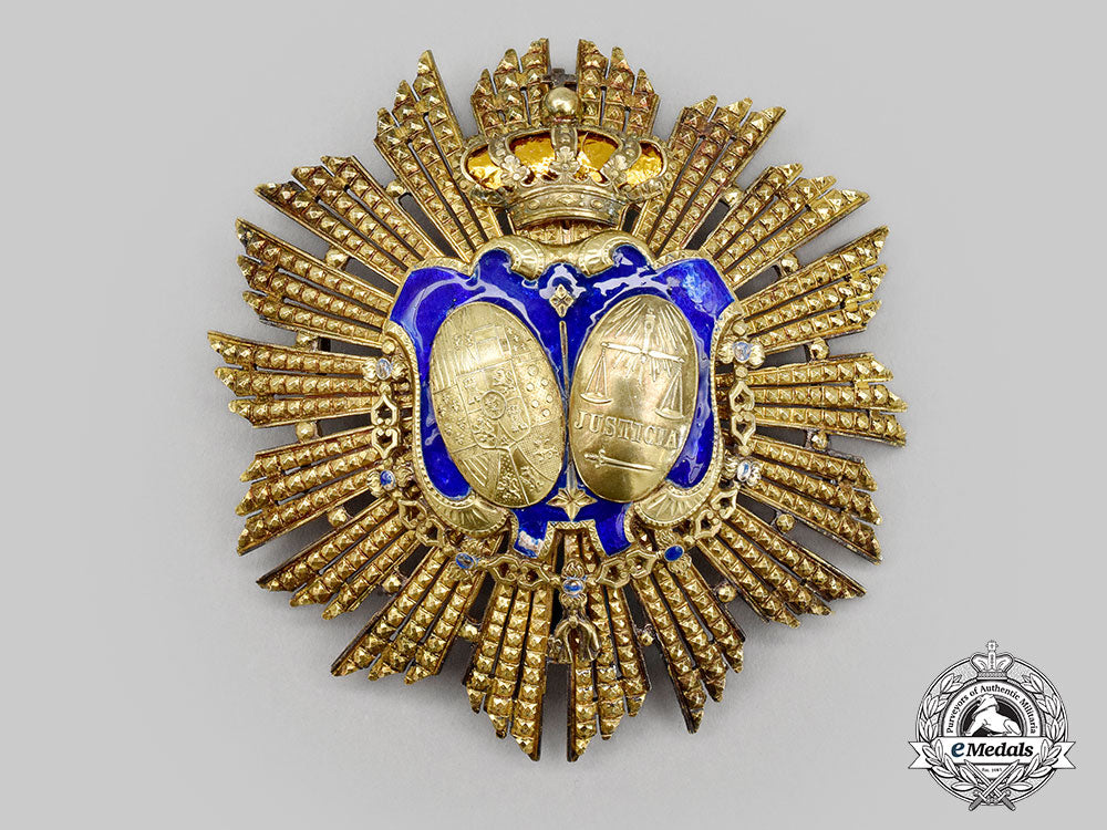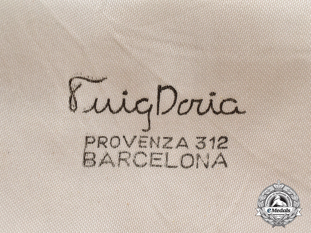 (Estrella de Honor para Jueces Militares). Multi-piece construction, Royal crown in silver gilt with red enamels, surmounting a shield in silver gilt with azure blue enamels, the shield bearing two oval insignia, the left one illustrating the Spanish coat-of-arms and the right one with the Scales of Justice above "JUSTICIA" (Justice), the shield framed by a golden fleece collar chain, mounted to an eighteen-pointed silver gilt star base, each star point with three faceted rays, measuring 84 mm (w) x 87 mm (h), vertical pinback flanked by dual stays, exhibiting chipping in the azure blue enamels in two locations on the shield and on six of the seven jewels on the collar chain, better than very fine. In its hardshelled case of issue, light brown felt exterior, inside lid in white satin and maker marked "Puig Doria PROVENZA 312 BARCELONA" (jeweller, Puig Doria of Barcelona, Spain), medal bed in white felt and padded, measuring 110 mm (w) x 100 mm (h) x 40.5 mm (d), exhibiting wear overlying the hinged area and scattered soiling in the white felt of the medal bed, case also better than very fine.
