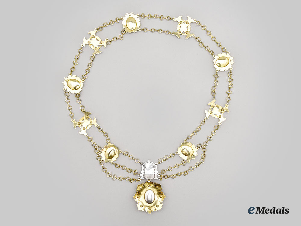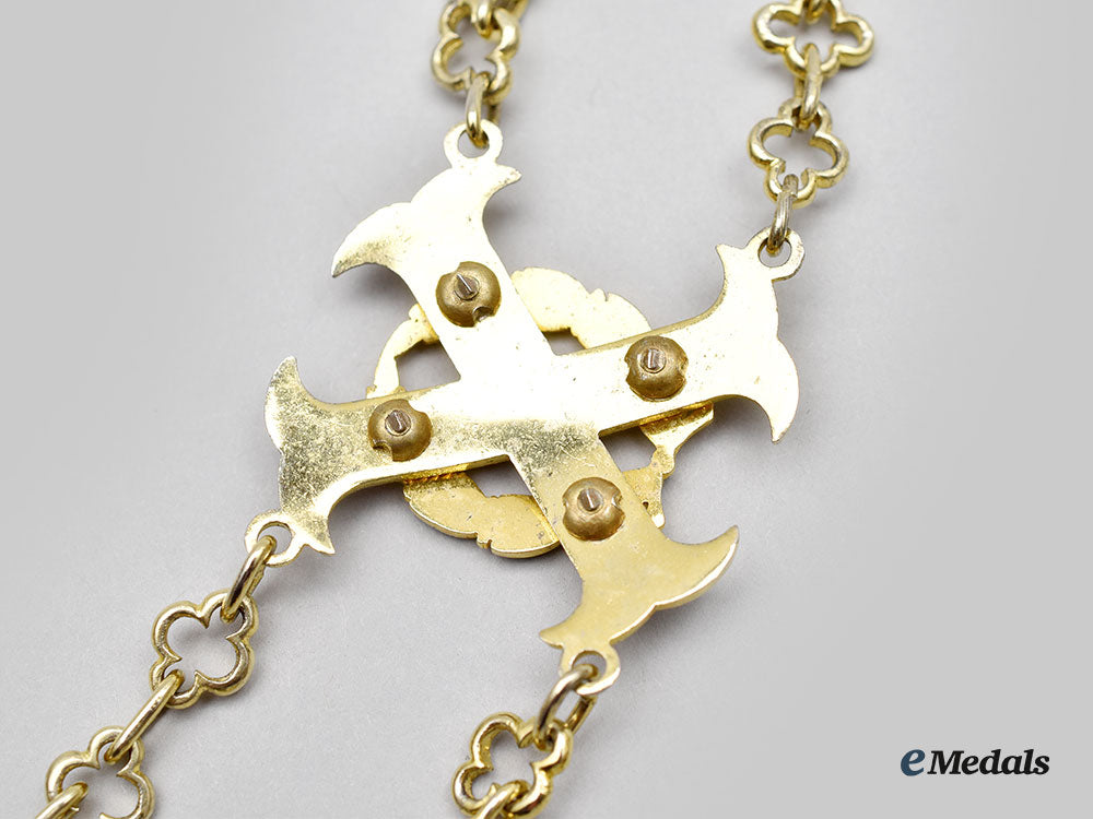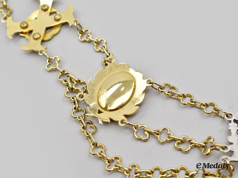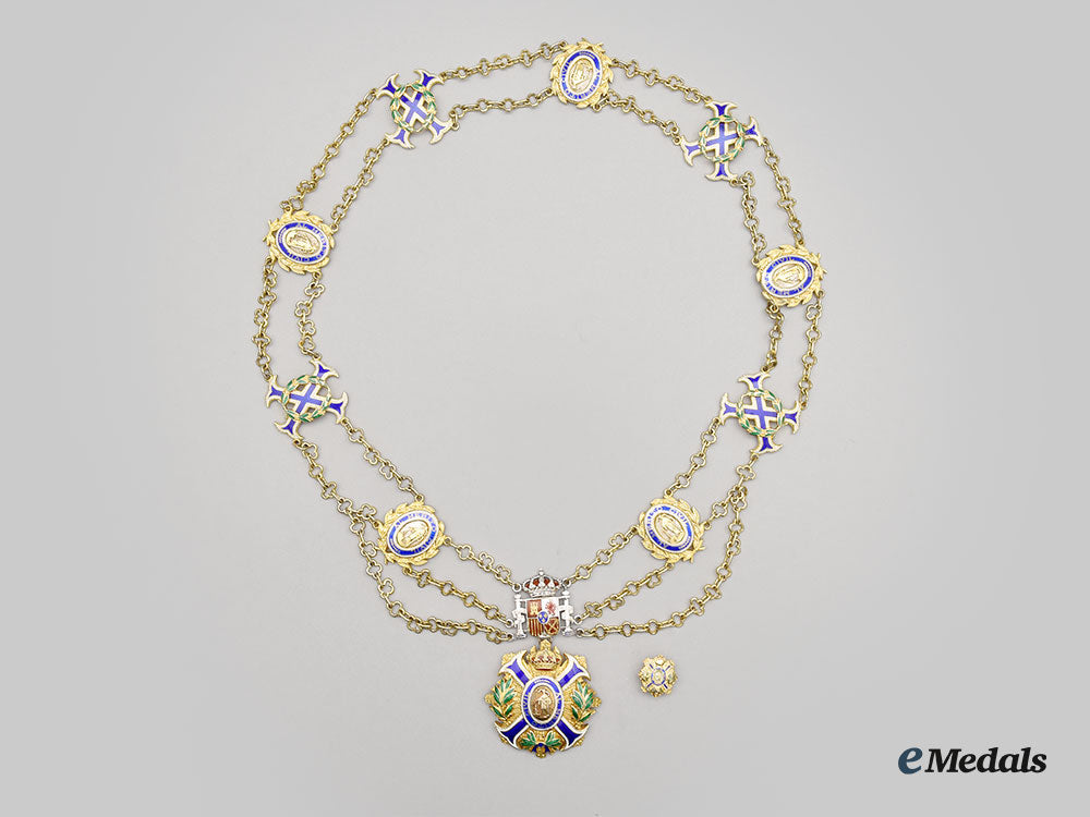 (Orden del Mérito Civil). Instituted June 25, 1926 by King Alfonso XII. Collar instituted 1957. In silver gilt, a collar comprising nine links, five of which are oval shaped bearing a female figure surrounded by a blue enamelled ring inscribed AL MERITO CIVIL, with an exterior gilt wreath, the reverse of each of these links is plain, these alternate with four blue enamelled cross links with superimposed green enamelled wreaths, the reverse of each of these links is plain with four large rivets for the wreath’s connection, the links are connected by a string of clover shaped rings, the central badge features a blue enamelled cross with lightly faceted rays in each quadrant, segments of a green enamelled wreath in three quadrants, and a crown at 12 o’clock between the arms, the obverse medallion features the female figure surrounded by a blue enamel ring inscribed AL MERITO CIVIL, suspended from the silver crowned Spanish coat of arms with red, blue, white, and green enamels, the reverse is plain, the badge measures 56.1mm (w) x 91.05mm (h – inclusive of surmounting coat of arms), the collar in its entirety weighs 282.4 grams, all enamels intact, reverse plate on medallion has been reattached, a scarce decoration in extremely fine condition.