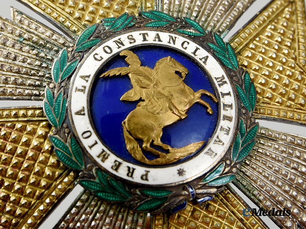 (Real y Militar Orden de San Hermenegildo). Instituted November 28th, 1814. A Maltese Cross constructed of gilded silver with a multi-faceted surface and dual ball finials, with five multi-faceted rays in the quadrants between the arms of the cross, the obverse with a blue circular central medallion bearing a superimposed figure of St. Hermenegildo, surrounded by a white enameled ring inscribed “Premio a la Constancia Militar, surrounded by a green enameled laurel wreath, the reverse with a functional vertical pinback and dual down-ward pointing stabilizer pins for secure attachment to a uniform, unmarked, measuring 86.3 mm (w) x 84.0 mm (l), with some of the original gilt worn off and displaying light patina from age and wear, in overall near extremely fine condition.