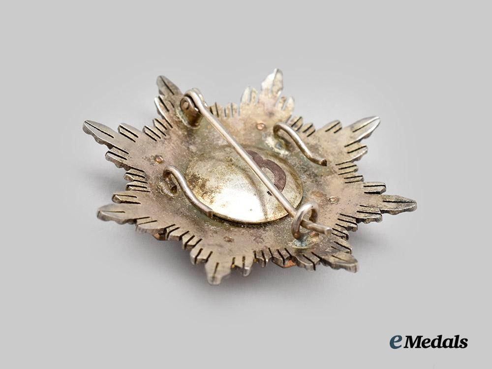 Order of Military Merit, Type I, II Class Breast Star (White Distinction), in, silver, silver gilt and enamels, featuring a white enamel cross with Spanish insignia in the central medallion, a bar and crown on the 12 o’clock arm, with alternating lions and castilles in each quadrant, the reverse features a vertical pin with dual stays, measures 62.4 mm (w) x 62.9 mm (h), enamels intact, reverse marked “3” in marker, remains in very fine condition.