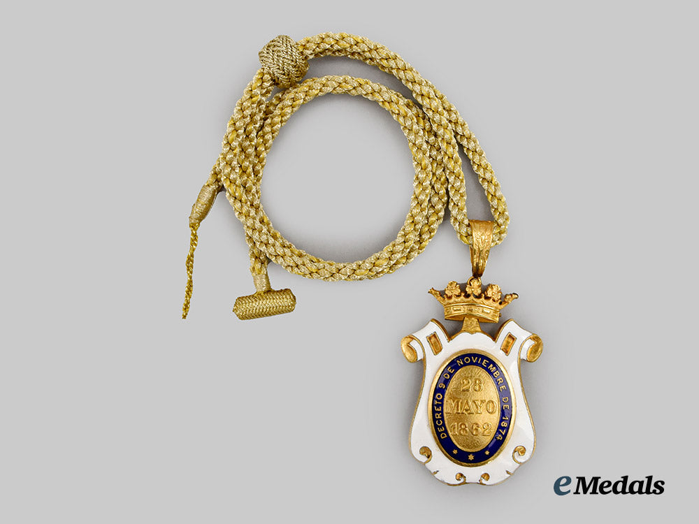 The badge in silver gilt and enamel, the obverse oval centerpiece bearing the image of a book within a wreath, surrounded by the words NIHIL PRIUS FIDE, the reverse oval centerpiece bearing the date 28 MAYO 1862, surrounded by the words DECRETO 9 DE NOVIEMBRE DE 1874 on a blue enameled field, topped by a gilt crown, 63.9 mm (h) x 43.5 mm (w), enamels intact, in extremely fine condition. The breast star in silver gilt and enamel, the obverse bearing the motto of Francoist Spain, vertical pinback with dual stays, 87.3 mm in diameter, enamelts intact, in extremely fine condition. In its hard-shelled case, white satin lined on the interior,black velvet medal bed, extremely fine condition.
