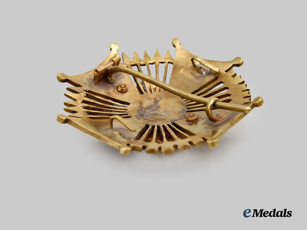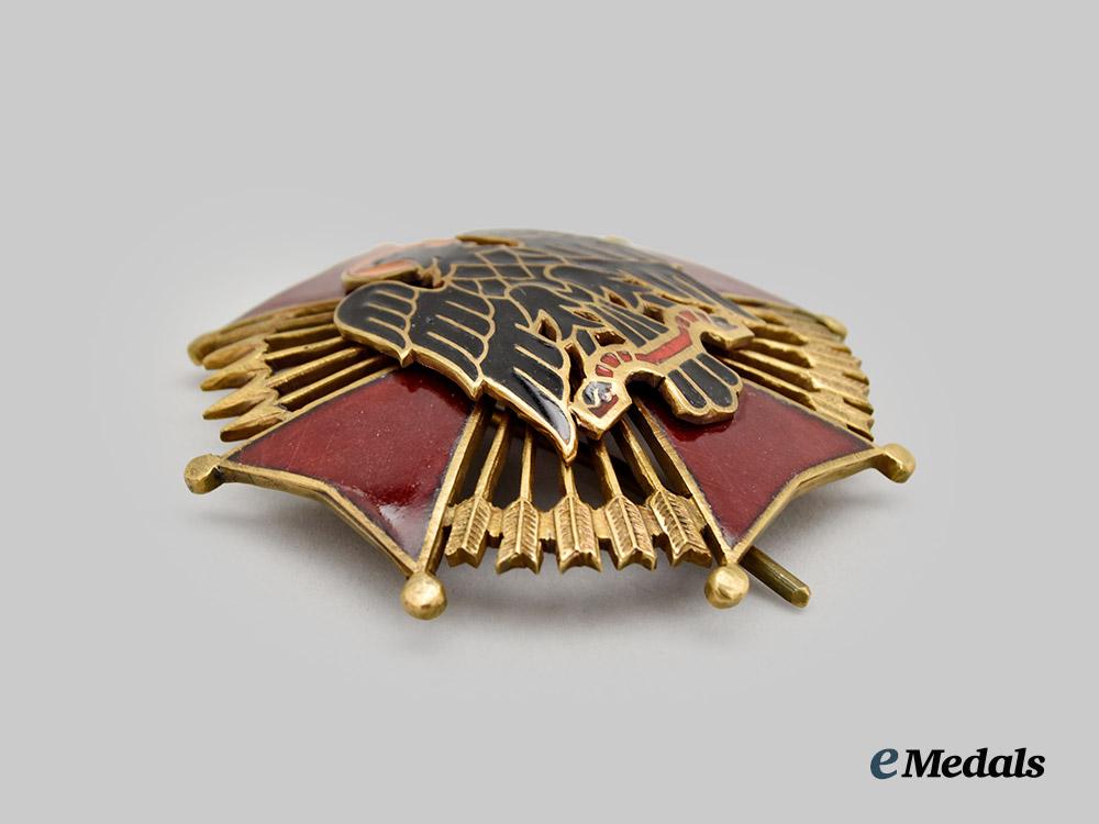 (Orden de Cisneros). Instituted in 1944. Two-piece construction, in silver gilt with red, black and yellow enamels, with two pins securing the eagle insignia to the Maltese cross and arrows base, measuring 67.3 mm (w) x 69.2 mm (h), ornate vertical pinback flanked by dual stays, enamels are intact, near extremely fine.