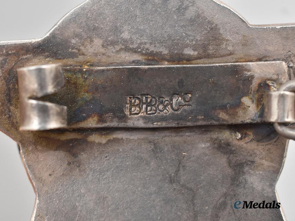 (Harp Madalyasi). Instituted in 1915. Multi-piece construction, in silvered bronze with red enamels, ball finials on the tips of the star points, measuring 55.7 mm (w) x 54.8 mm (h), maker marked "B.B.&Co" (unidentified maker in Berlin) on the reverse, horizontal pinback, light contact overall, extremely fine.
