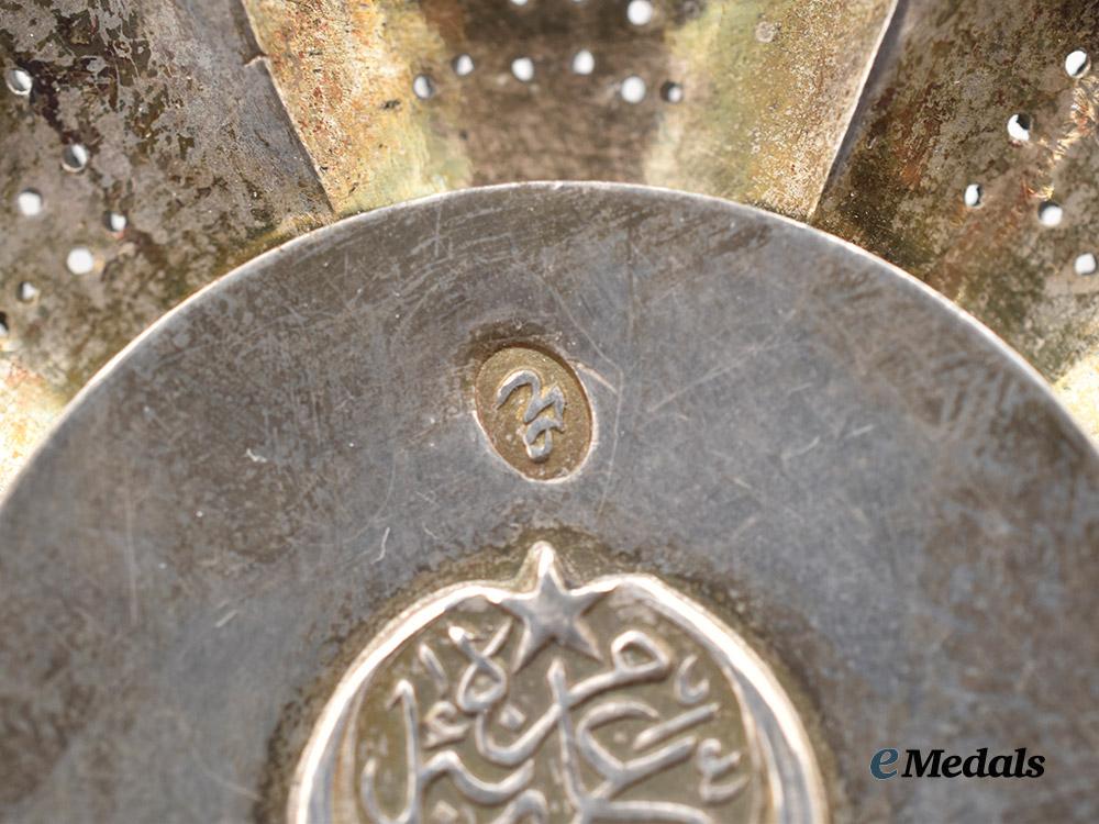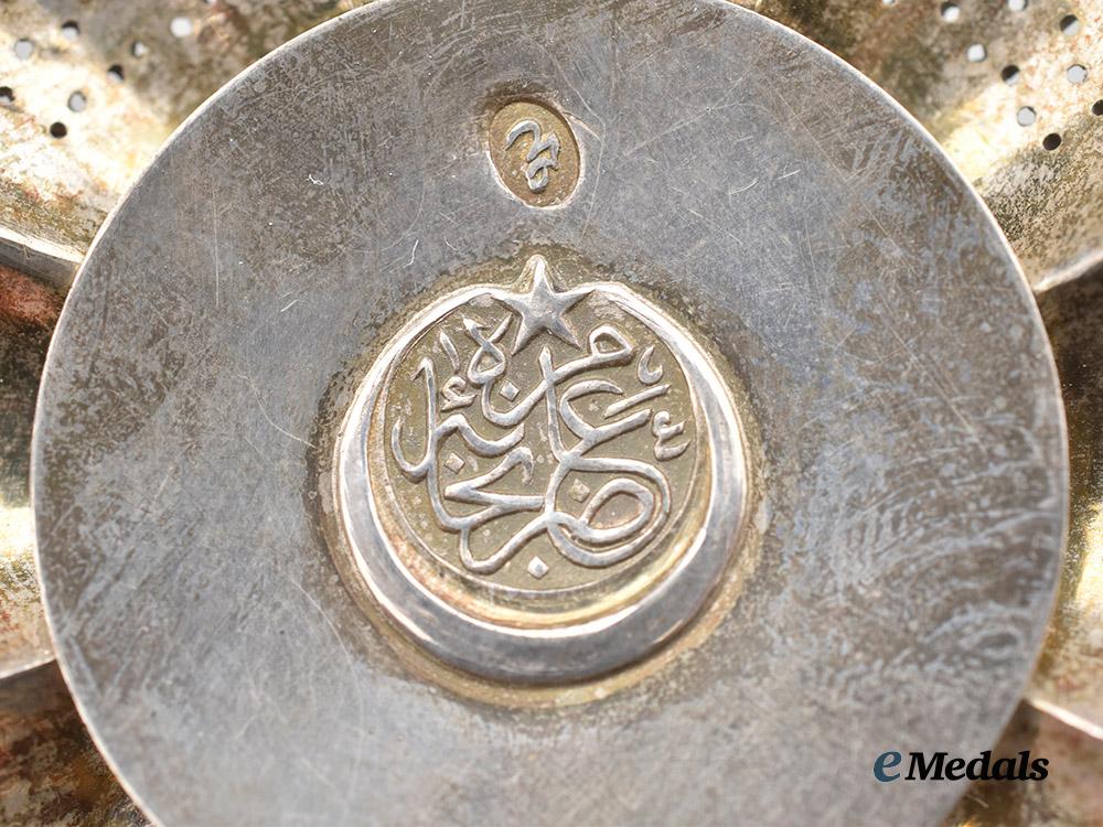 (Osmanlı Devlet Nişanı). Instituted in January 1862. Civil Division. A breast star constructed of a silver, eight-pointed star of faceted rays, the obverse centre presents a red enamelled centre bearing a gilded crescent moon and inscription in Arabic, surrounded by a green re-enamelled ring, the reverse presents a vertical pin flanked by dual stays, presenting a silver standard mark, measuring 82.6 mm (w) x 81.3 mm (h), weighing 65.42 grams, enamels intact, lovely toning to the silver rays, in extremely fine condition.