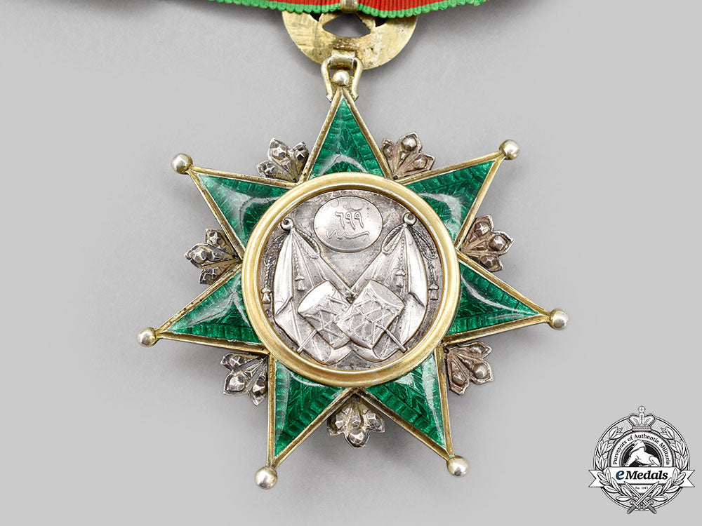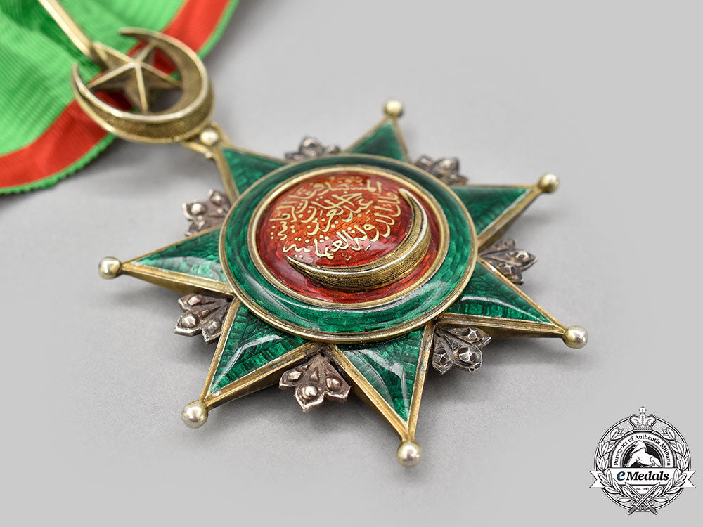 (Nishan-i-Osmania). Instituted in 1861. Type II with Green Enamels. In silver gilt with red and green enamels, unmarked, designed with seven star points with three protruding rays between each star point, obverse centrepiece illustrating a upward-facing crescent moon with gilt Arabic script above, reverse centrepiece illustrating a trophy-of-arms with the year in Eastern Arabic numerals "٦٩٩" = AH 699 (1299/1300 AD, the year of the creation of the Ottoman Empire), measuring 62.5 mm (w) x 81 mm (h) inclusive of its star and crescent moon suspension, intact enamels, on its original full-length neck ribbon, extremely fine.