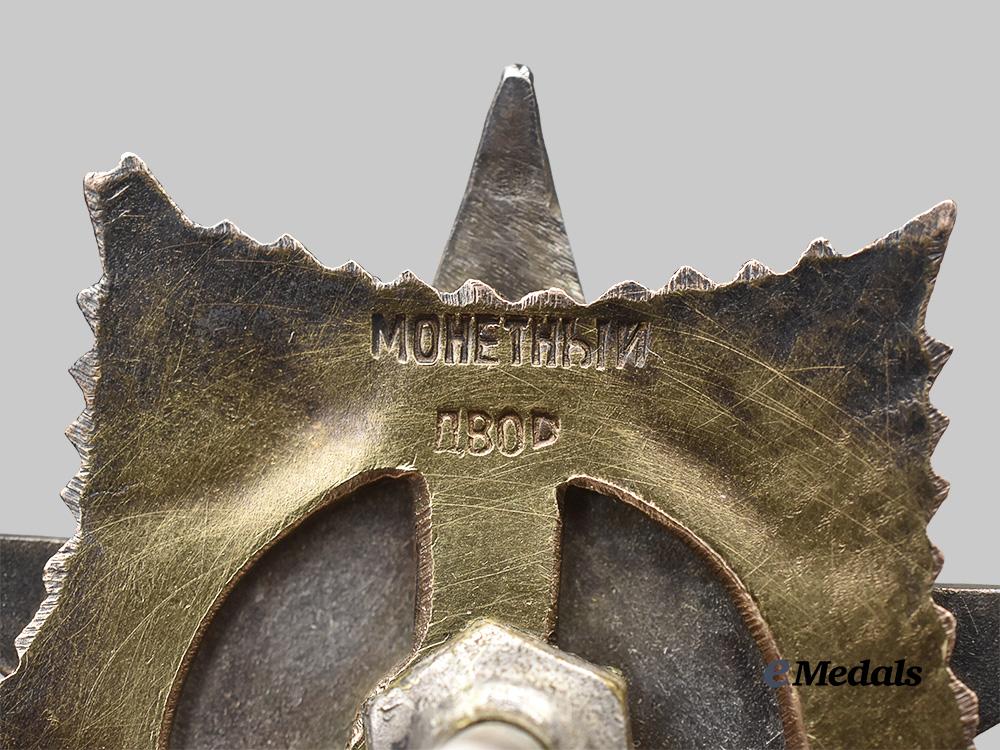 An Order of the Patriotic War, I Class. Type II. Three-piece construction, the insignia in silver, and silver gilt with red and white enamels and incorporating a hammer and sickle in Gold in the centrepiece, mounted to a five-pointed star base in Gold, each star point with nine emanating rays, weighing 42.56 grams, mint marked "МОНЕТНЫЙ ДВОР" (Monetny Dvor) and number engraved "271541" on the reverse, measuring 43.5 mm (w) x 46.2 mm (h), screwback, the insignia exhibiting multiple contact marks on the red enamels on the star point at 12 o'clock, the remaining enamels intact, loss of gilt on the rays, near extremely fine.