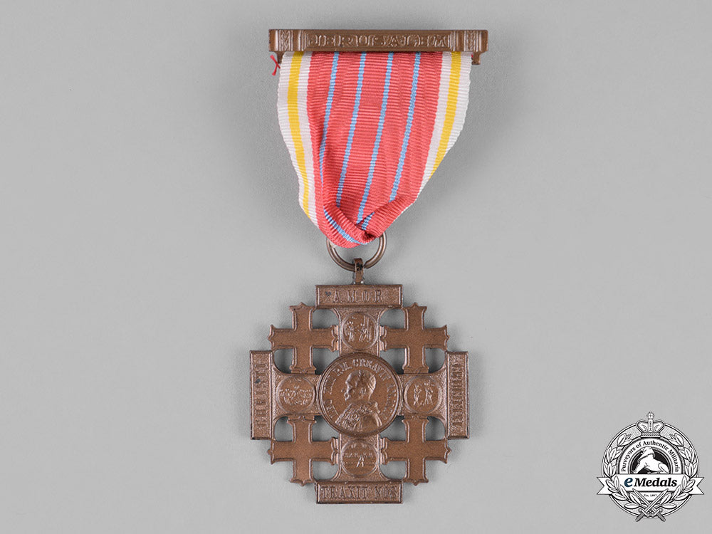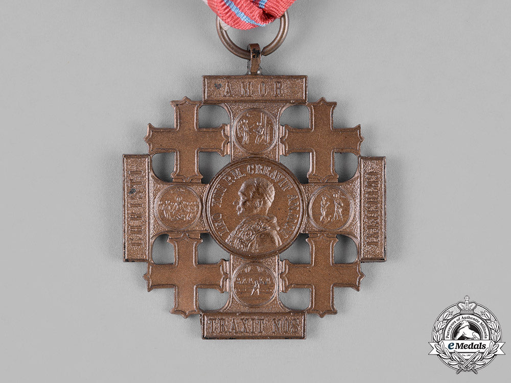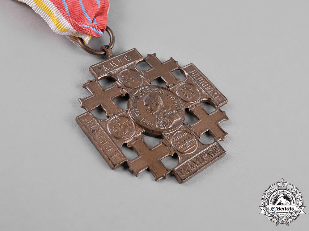 Instituted in 1901. In bronze, obverse with the left-facing bust of Pope Leo XIII surrounded by the inscription in Latin "LEO XIII P.M. CREAVIT AN. MCM" (Founded by Leo XIII in 1900) in the centre, the centrepiece surrounded by four scenes illustrating the Annunciation of the Blessed Virgin Mary, the Nativity, the Baptism of Our Lord and the Last Supper, inscribed on the arms, clockwise from the left "CHRISTI / AMOR / CRUCIFIXI / TRAXIT NOS" (The Love of Christ Crucified has Drawn Us), reverse illustrating the Resurrection in the centre, the centrepiece surrounded by four scenes, with Jesus praying in the garden, scourged, crowned with thorns and being crucified, inscribed in Latin on the arms, clockwise from the left "SIGNUM / SACRI / ITINERIS / HIEROSOL" (A Token of Holy Pilgrimage to Jerusalem), measuring 43 mm (w) x 43 mm (h), original ribbon suspended from a hanger inscribed "JERUSALEM" with pinback, extremely fine.
