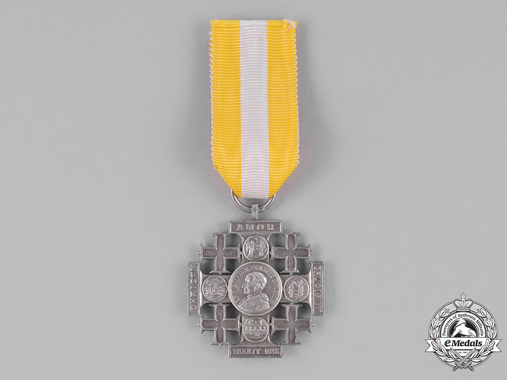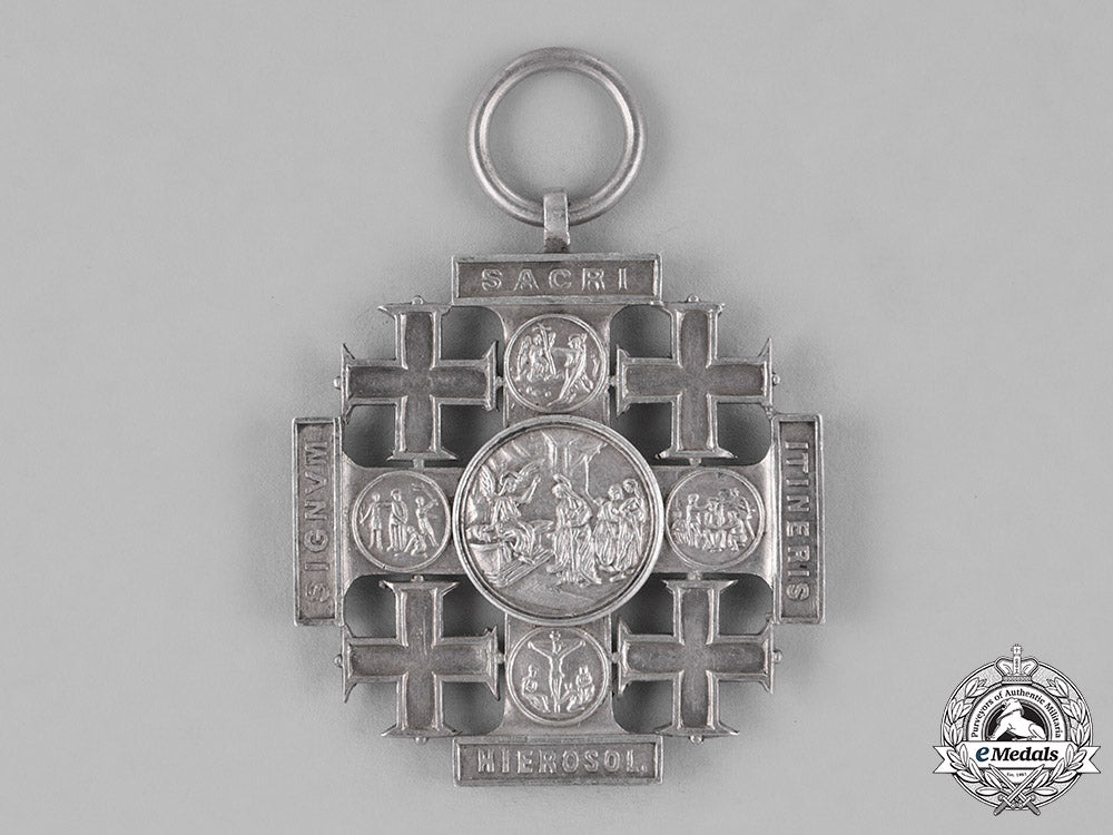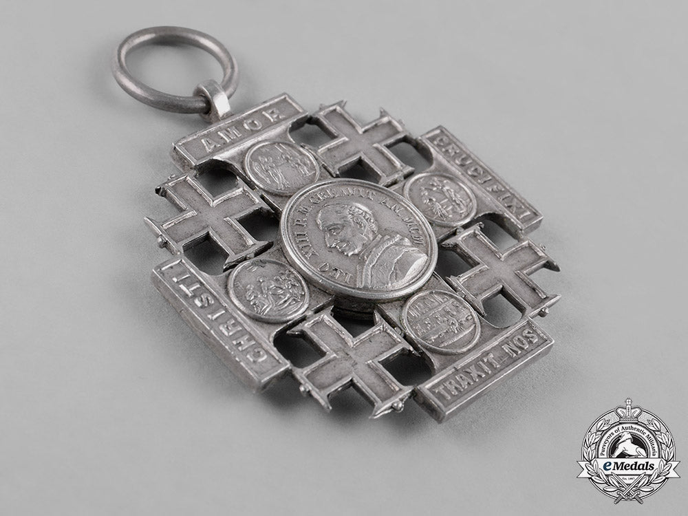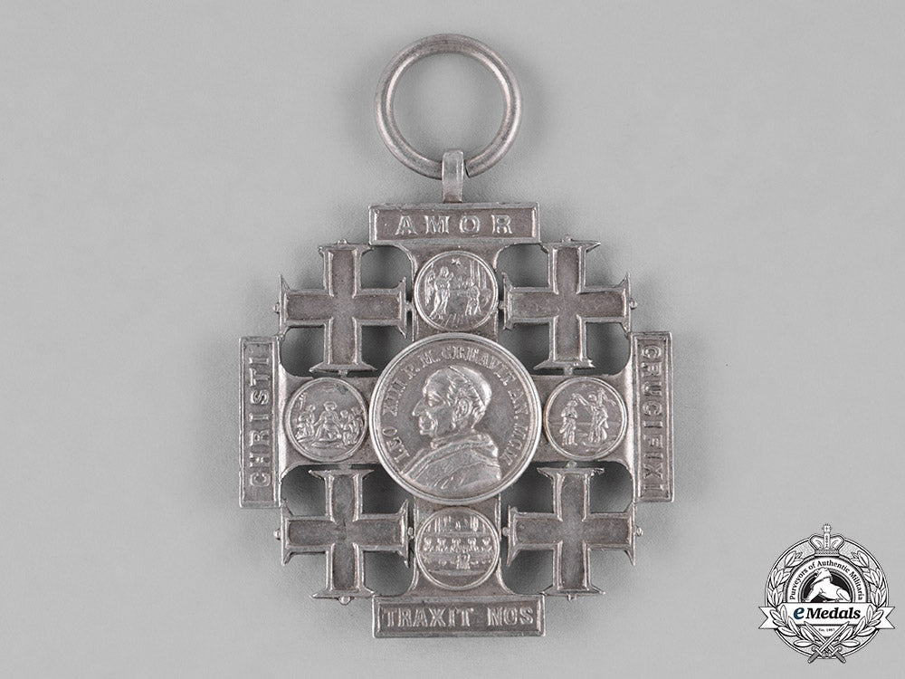 Instituted in 1901. In silver, obverse with the left-facing bust of Pope Leo XIII surrounded by the inscription in Latin "LEO XIII P.M. CREAVIT AN. MCM" (Founded by Leo XIII in 1900) in the centre, the centrepiece surrounded by four scenes illustrating the Annunciation of the Blessed Virgin Mary, the Nativity, the Baptism of Our Lord and the Last Supper, inscribed on the arms, clockwise from the left "CHRISTI / AMOR / CRUCIFIXI / TRAXIT NOS" (The Love of Christ Crucified has Drawn Us), reverse illustrating the Resurrection in the centre, the centrepiece surrounded by four scenes, with Jesus praying in the garden, scourged, crowned with thorns and being crucified, inscribed in Latin on the arms, clockwise from the left "SIGNUM / SACRI / ITINERIS / HIEROSOL" (A Token of Holy Pilgrimage to Jerusalem), measuring 41.5 mm (w) x 46.8 mm (h) inclusive of integral suspension, replacement ribbon, extremely fine.