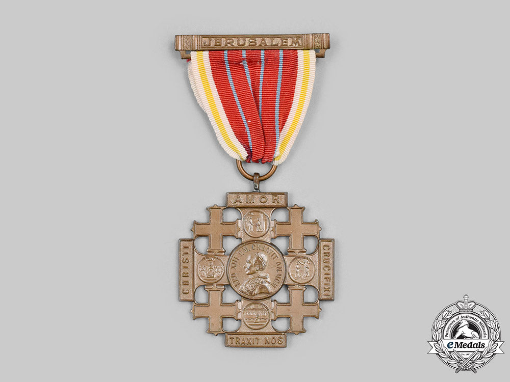 (Signum Sacri Itineris Hierosolymitani). Instituted in 1901. In bronze, measuring 42.7 mm (w) x 48 mm (h) inclusive of its integral suspension, original ribbon suspended from a hanger inscribed "JERUSALEM" with pinback, extremely fine.