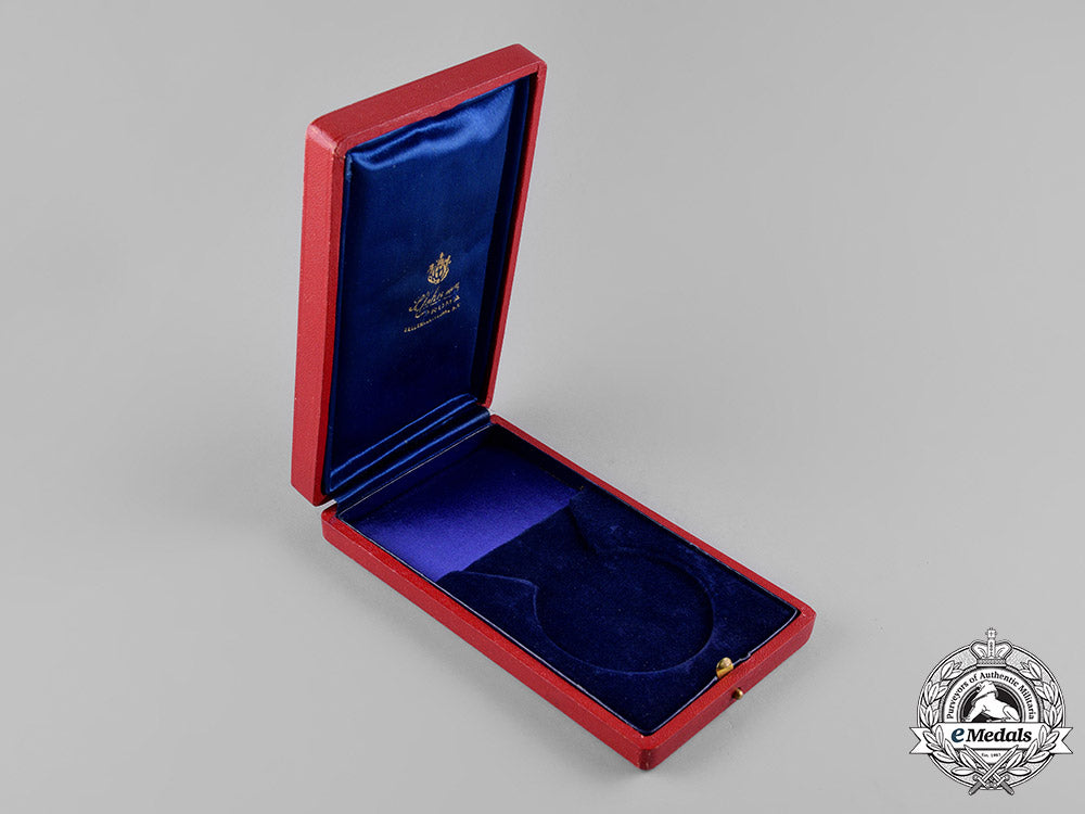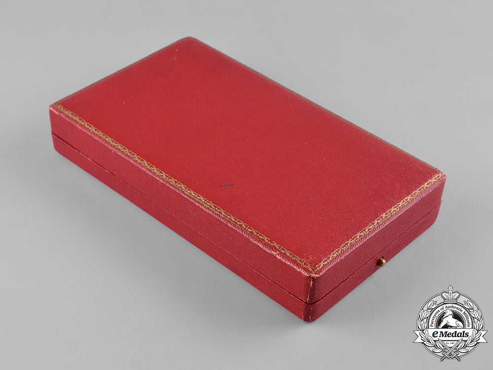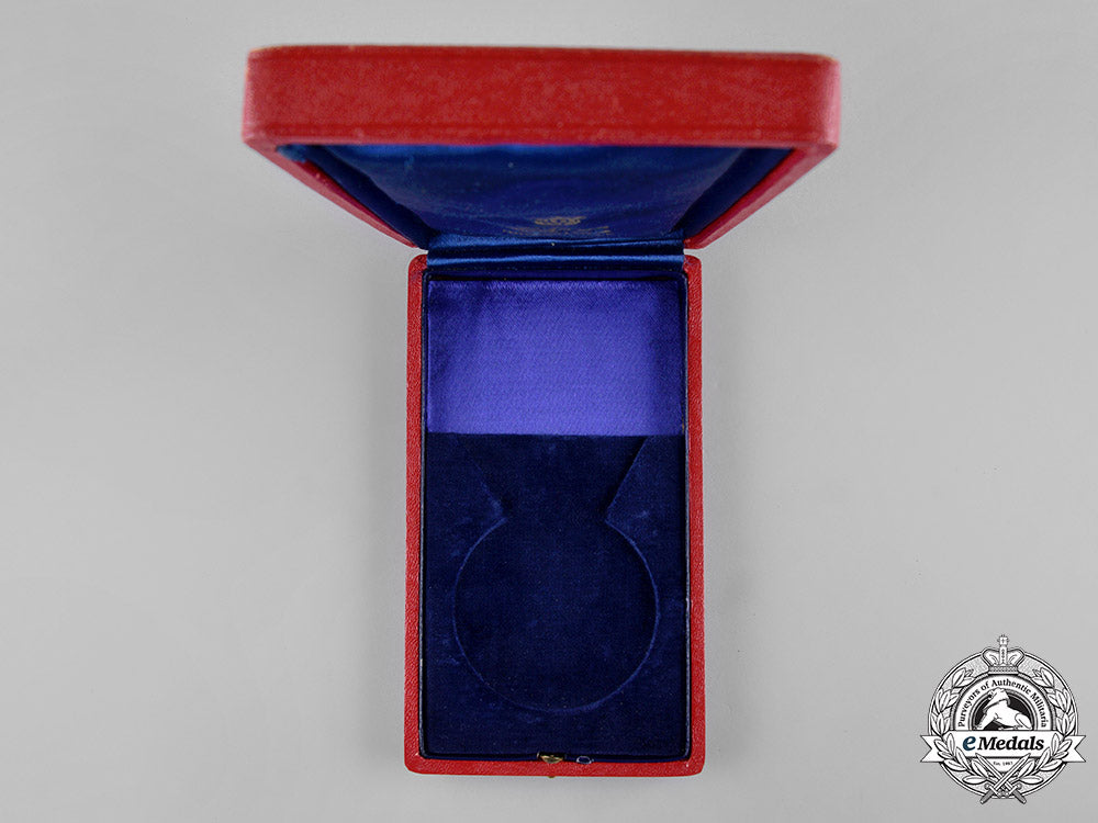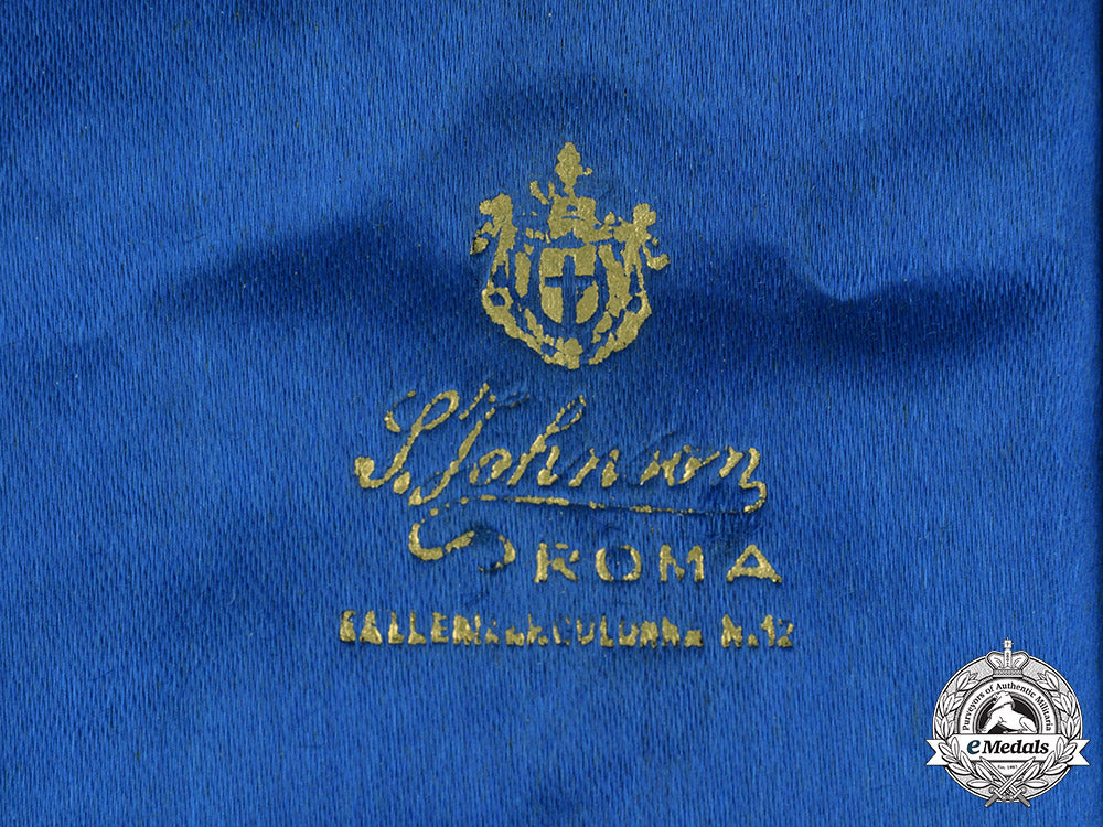 Constructed of a wood frame with a faux red leather exterior, the obverse lid with a stylized gold border, the interior with a padded blue satin-type lid liner, with a gold maker’s mark of “S. Johnson, Roma, Galleria Colonna N. 12”, with an intact hinge cover, with a depressed blue doeskin medal bed, opening with a functional bronze spring catch with exterior stud release, with a functional magnetic metal hinge, measuring 85 mm (w) x 148 mm (l) x 26 mm (h), in near extremely fine condition.