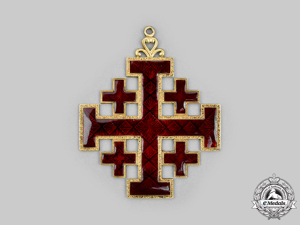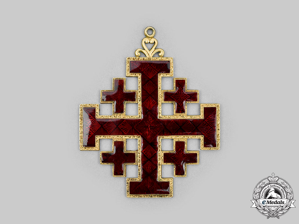 (Ordo Equestris Sancti Sepulcri Hierosolymitani). Instituted in 1847. In silver gilt with red enamels, measuring 52.5 mm (w) x 64.3 mm (h) inclusive of its integral ring, intact enamels, extremely fine.