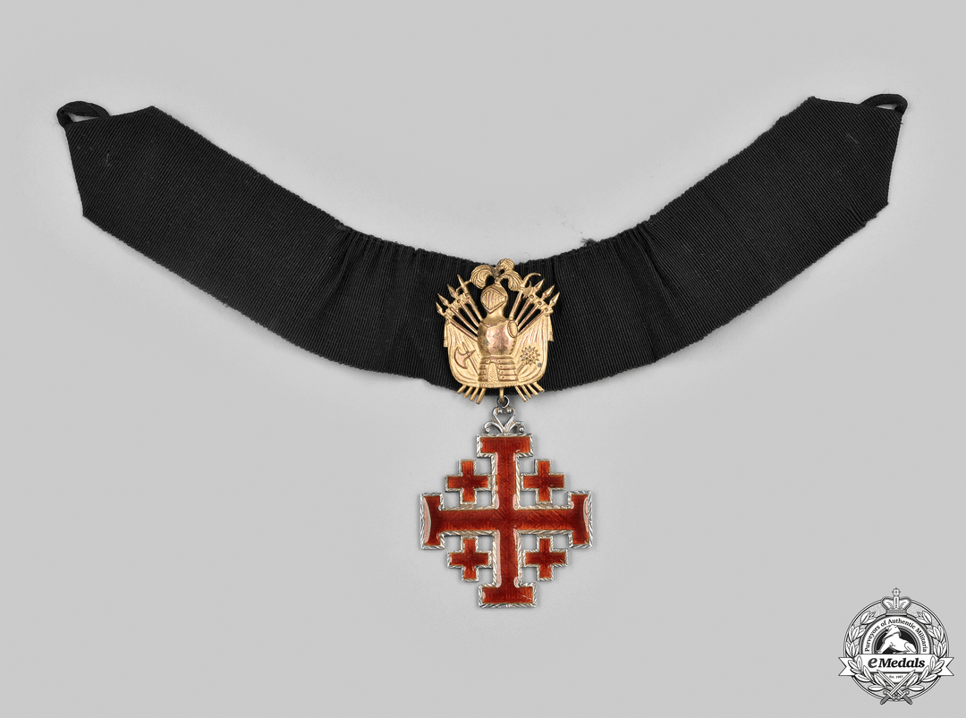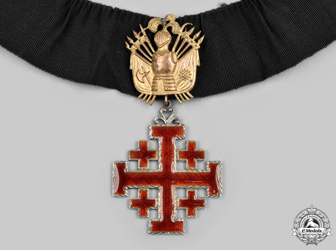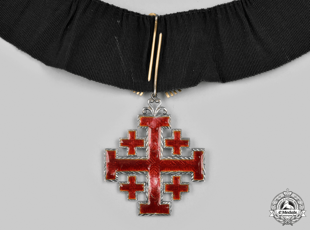 (Ordo Equestris Sancti Sepulcri Hierosolymitani). Instituted in 1847. In silvered bronze with red enamels, measuring 51.5 mm (w) x 104 mm (h) inclusive of its trophy of arms suspension, the arms in bronze gilt, crazing and chipping evident in the red enamels on the reverse, on its original full-length neck ribbon, fine.