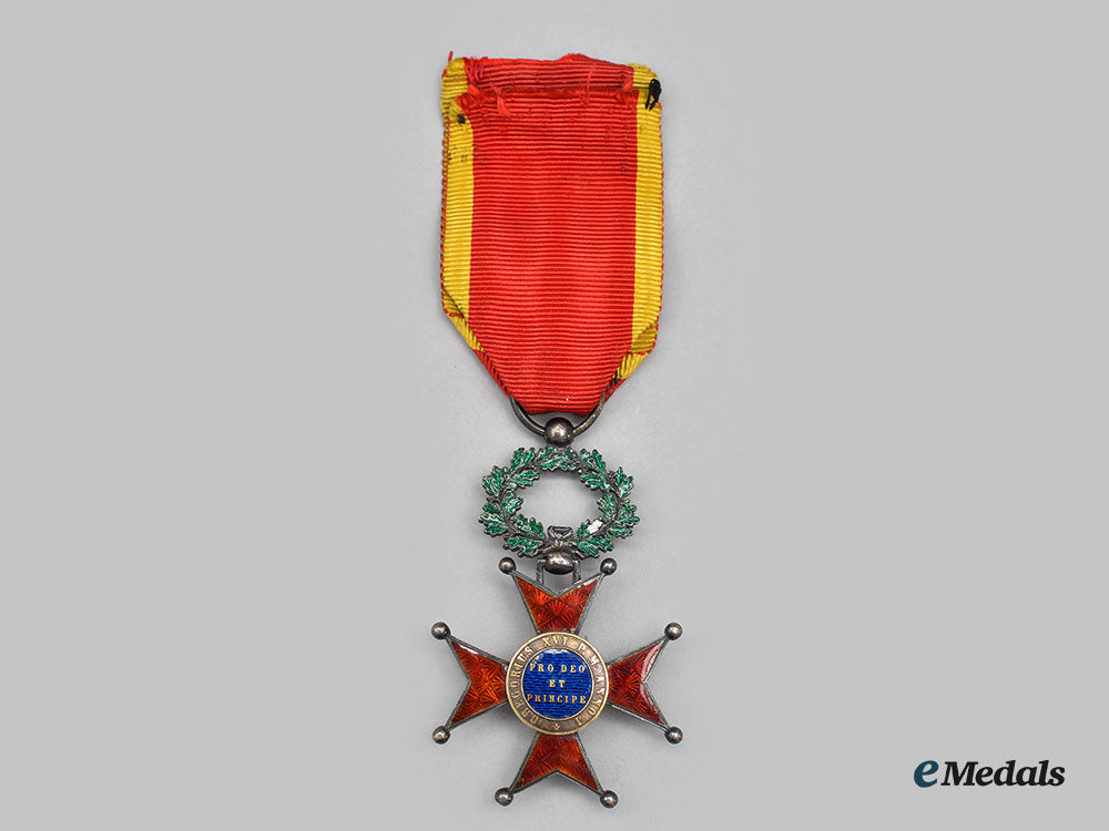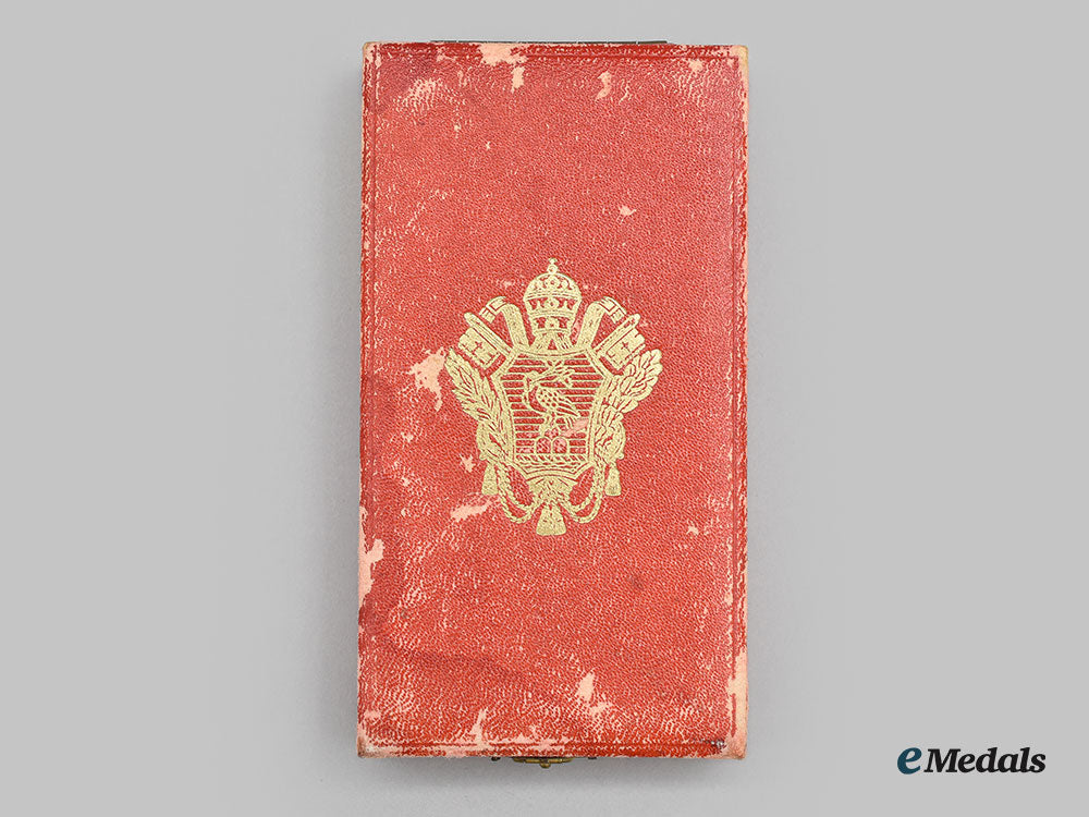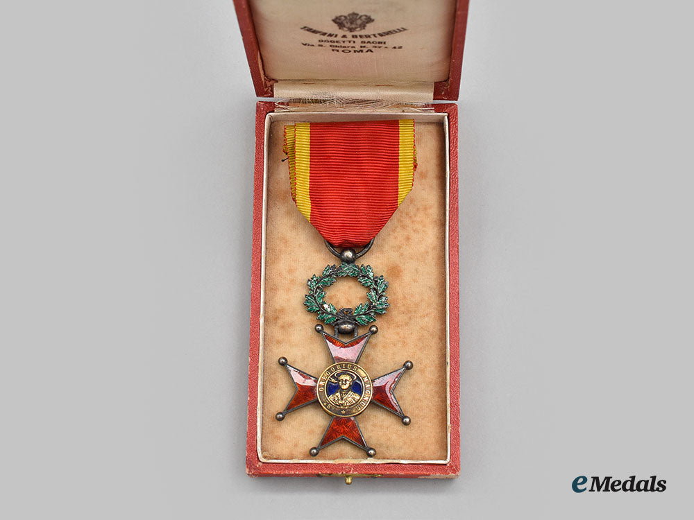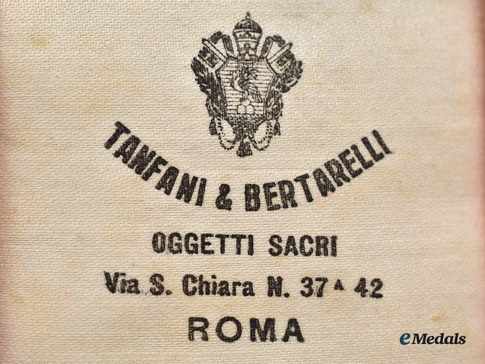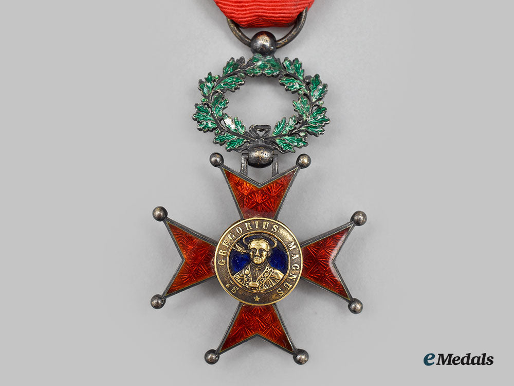 (Ordine di San Gregorio Magno). Instituted in 1831. Multi-piece construction, in silver gilt with red and blue enamels, each of the eight points of the cross exhibiting a ball finial, surmounted by a wreath in silver gilt with red and green enamels, unmarked, measuring 40.5 mm (w) x 63.8 mm (h) inclusive of its wreath and laterally-pierced ball suspension, chipping and loss evident in the green enamels on both sides of the wreath, the enamels on the badge intact, original ribbon, very fine. In its hardshelled case of issue, red dimpled exterior, Vatican coat-of-arms in gold-coloured ink on the lid, inside lid in white cloth, padded and maker marked "TANFANI & BERTARELLI OGGETTI SACHI Via S. Chiara N. 37A 42 ROMA", base with a medal bed in beige felt, measuring 63 mm (w) x 115 mm (h) x 20 mm (d), wear and scuffing evident on the exterior, wear in the fabric overlying the hinged area, the beige felt of the medal bed exhibiting extensive soiling, case fair.