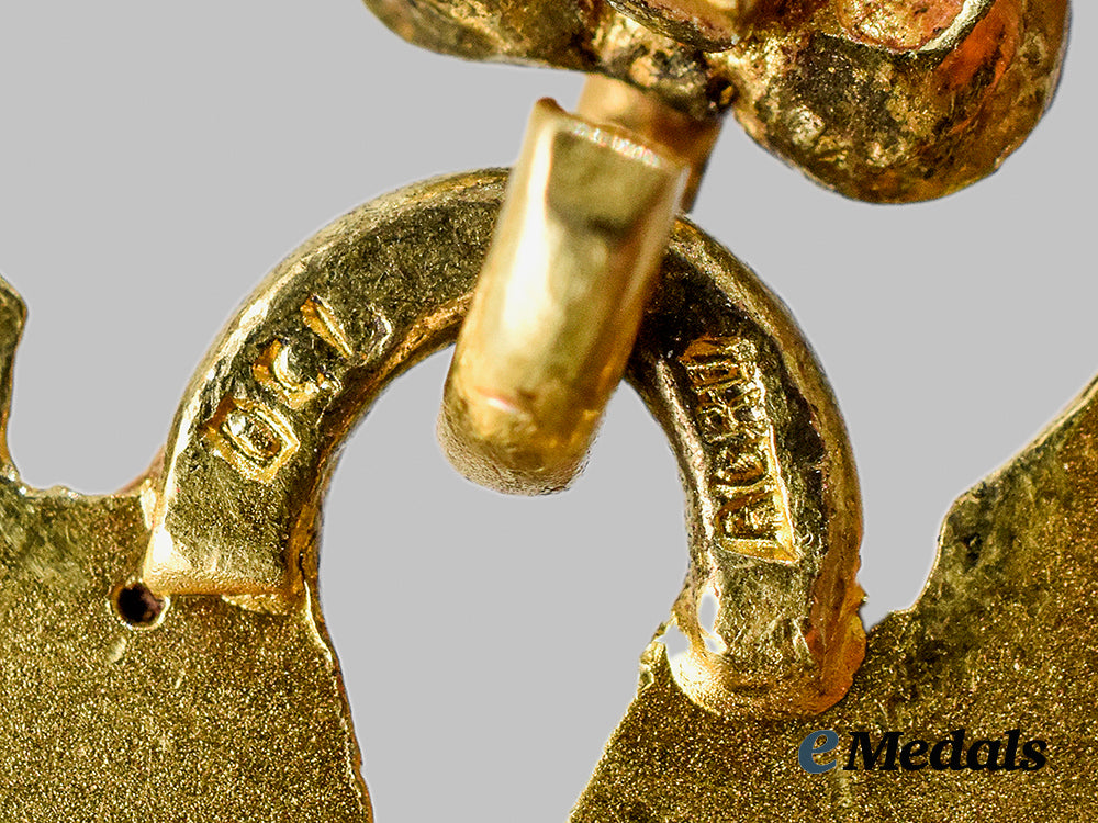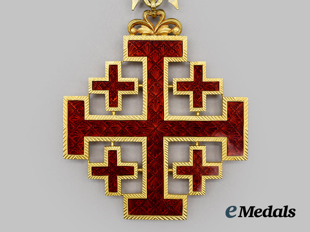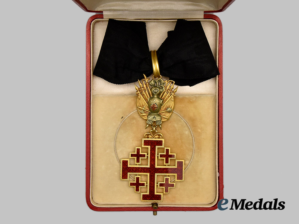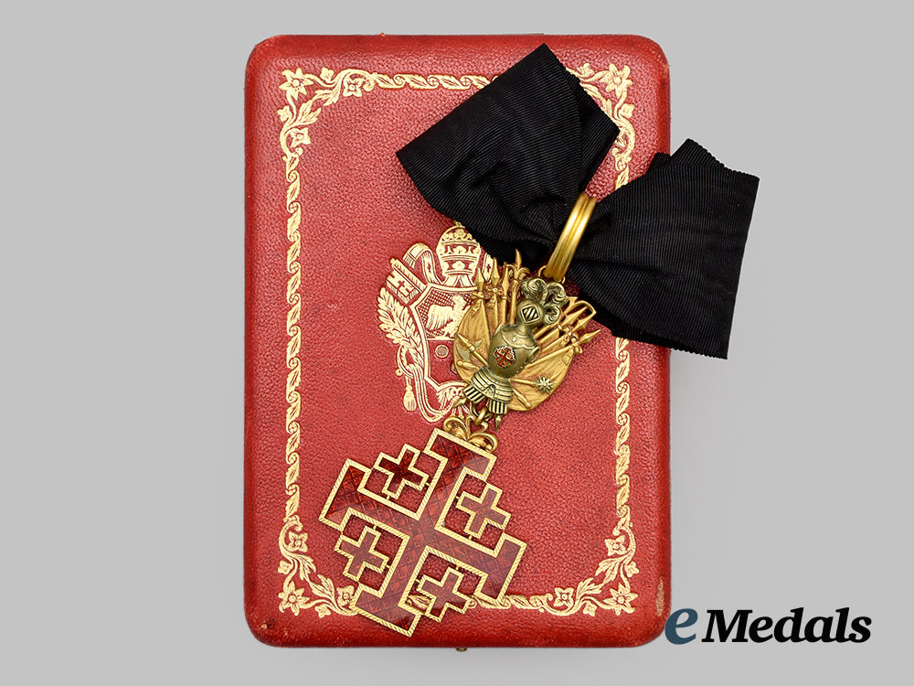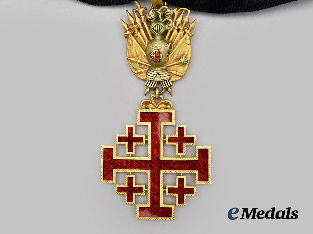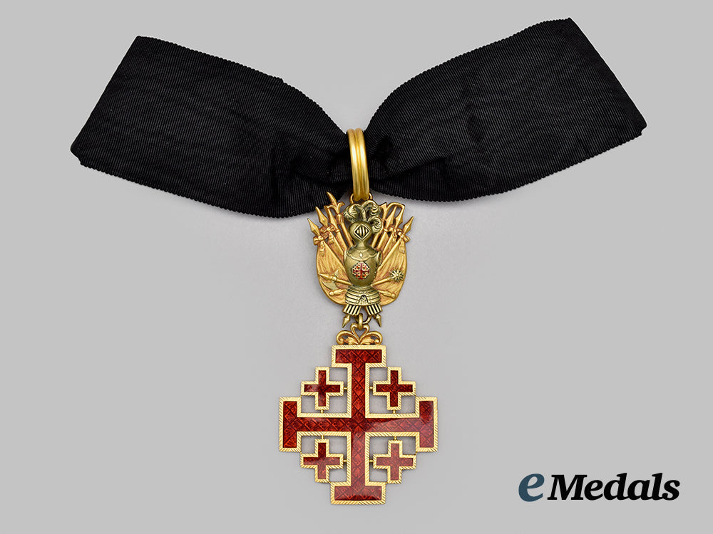 (Ordine del Santo Sepolcro / Ordo Equestris Sancti Sepulcri Hierosolymitani = OESSH). Instituted in 1099, re-organized in 1847. In 18K Gold, a beautiful commander cross presenting a Jerusalem cross in red enamels, the reverse mirrors the obverse, suspended from a trophy of arms suspension, hallmarked on reverse of suspension with 750 Gold mark and AGRU, marked 750 on the interior of the suspension loop, measures 52.0mm (w) x 104.8mm (h), weighs 69.7 grams, accompanied by a full length neck ribbon with button closure at the ends, enamels intact, a beautiful decoration in better than extremely fine condition.