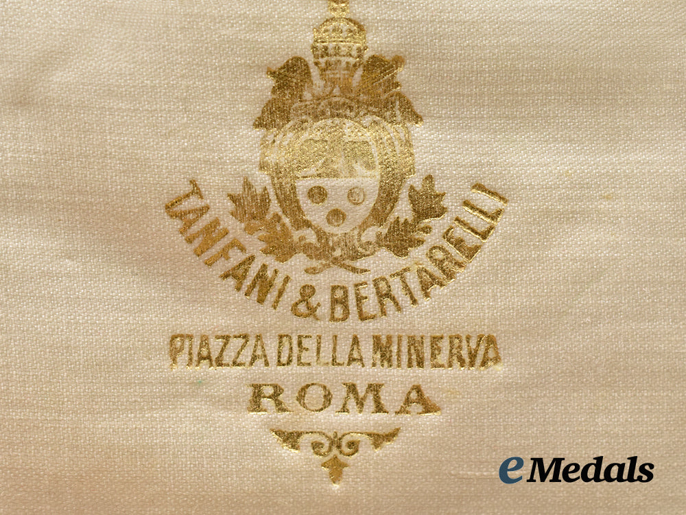 Contained in its original case of issue, a red leatherette exterior with gilt decoration and Vatican emblems, the interior lid is marked TANFANI & BERTARELLI, the base in a crème coloured velvet medal bed with ribbon section and structured center to host decoration, measures 115mm (w) x 165mm (h) x 30mm (d), hinge and clasp functional, remains in very fine condition.