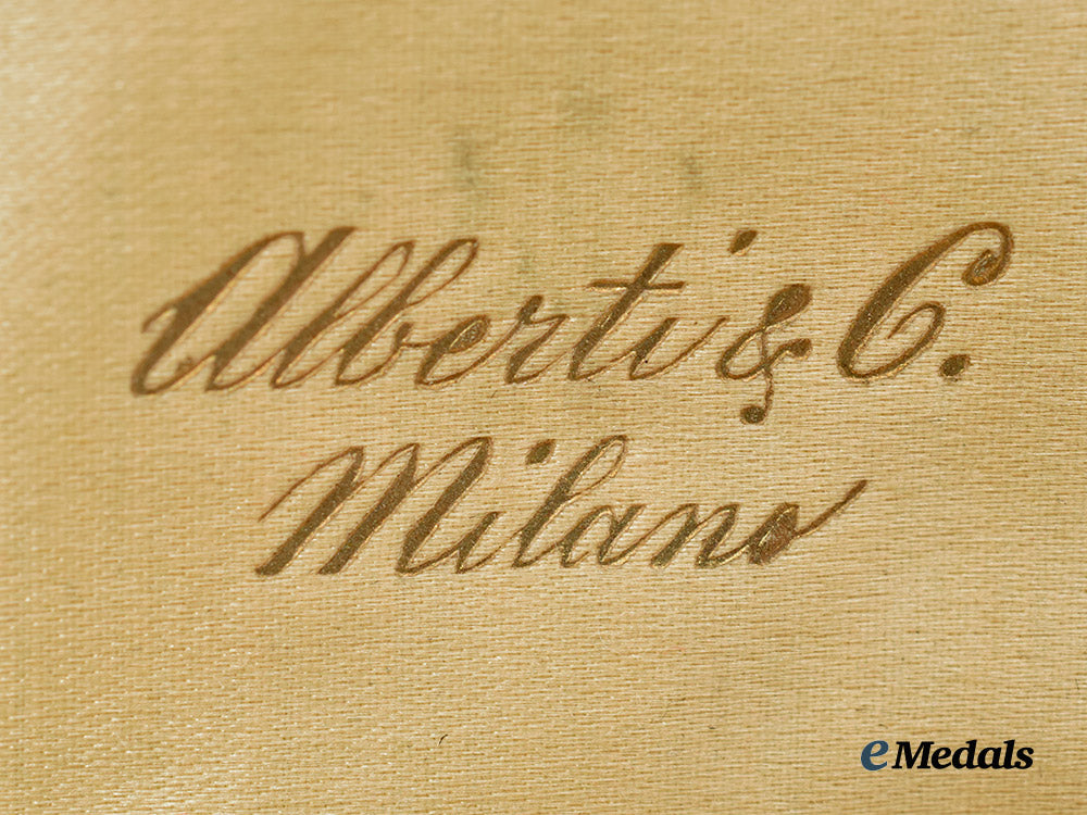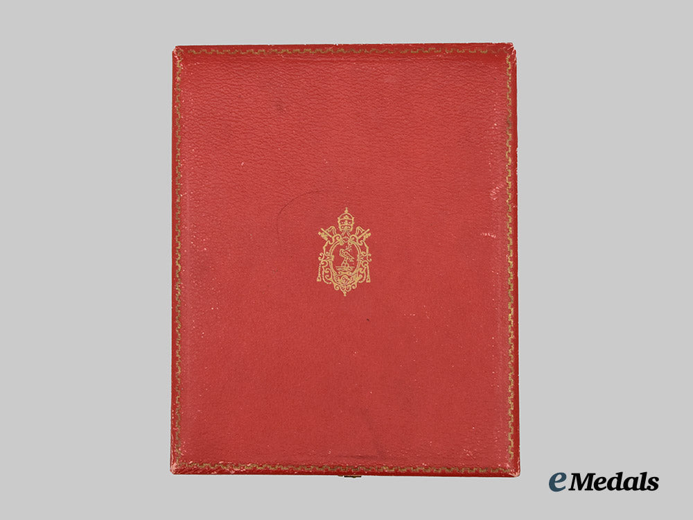 Accompanied by a presentation case for the award, constructed of a lightweight wooden core, with a red faux leather exterior, the exterior of the lid embossed with a Vatican Seal embossed in gilt, the interior of the lid lined with off-white silk, embossed with “Albertis & G, Milano” in gilt lettering, with a space for the placement of the ribbon on the base of the case, with a recessed medal bed for the award, functional exterior metal hinge with intact interior fabric hinge cover, measuring 130 mm (w) x 160 mm (l), in extremely fine condition.