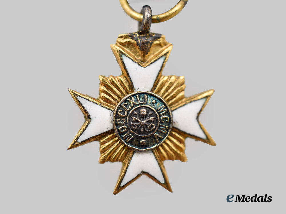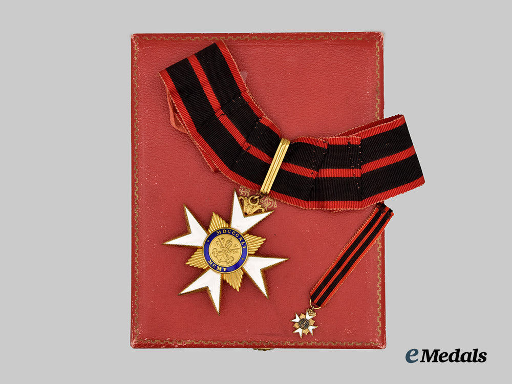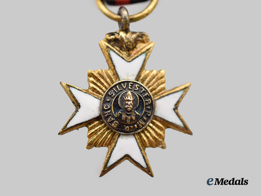 (Ordine di San Silvestro Papa). Instituted October 31st, 1841. Constructed of gilded silver with blue and white enamels, suspended from a fixed loop and broad swivel ring from its period original neck ribbon, consisting of a Maltese Cross with white enameled arms, and with a strand of rays emanating from the centre in the quadrants between the arms of the cross, the obverse with a central blue enameled medallion bearing a gilt portrayal of Saint Sylvester, surrounded by a broad gilt ring inscribed with “Sanctus Sylvester” in capital lettering, the reverse with a central medallion bearing the coat of arms of the Vatican, surrounded by the date “1841” in roman numerals withing a blue ring of enamels, unmarked, measuring 61.1 mm (w) x 63.9 mm (l), weighing 40.61 grams, accompanied by a miniature of the award constructed of silver gilt and suspended by a miniature version of the matching ribbon, measuring 14.1 mm (w) x 17.8 mm (l), in overall extremely fine condition.