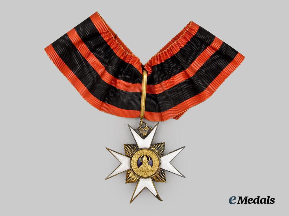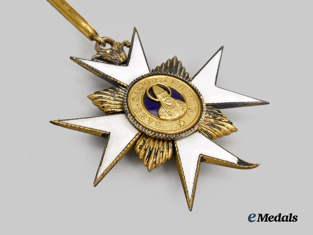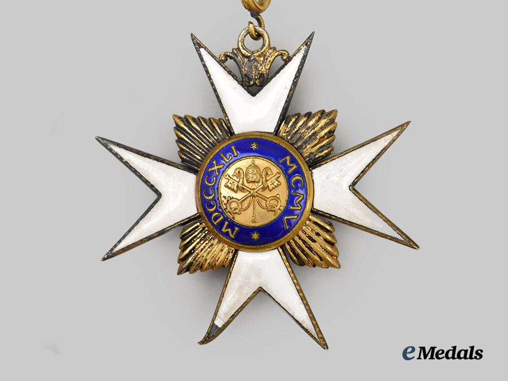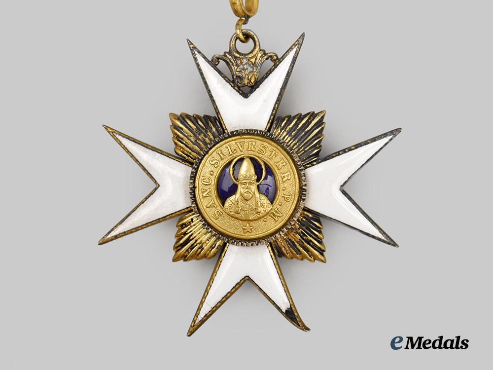Instituted October 31, 1841. A Grand Officer Set, including the neck decoration, consisting of silver gilt, a white enamelled Maltese cross with silver gilt rays in each quadrant, the obverse medallion presenting St. Sylvester on a blue enamel field, surrounded by the inscription SANC. SILVESTER. P.M., the reverse featuring the coat of arms of the VAtican , surrounded by the subscription MDCCCXLI MCMV, measures 60.4 mm (w) x 61.3 mm (h - inclusive of integral ring), weighs 45.6 grams, worn on original full length neck ribbon, heavy gilt wear, 6 o’clock arm bent with a loss of enamel in the corner on obverse and reverse, in very fine condition. The Star of the Order, in silver, an eight point star with faceted rays, white enamelled Maltese cross with silver gilt rays in each quadrant, the obverse medallion presenting St. Sylvester on a blue enamel field, surrounded by the inscription SANC. SILVESTER. P.M., the reverse presenting a single vertical pin, reverse marked TANFANI & BERTARELLI in the center, measures 81.8 mm (w) x 82.7 mm (h), weighs 62.5 grams, edges of rays very dark, enamels intact, pin and hinge functional, in very fine condition.