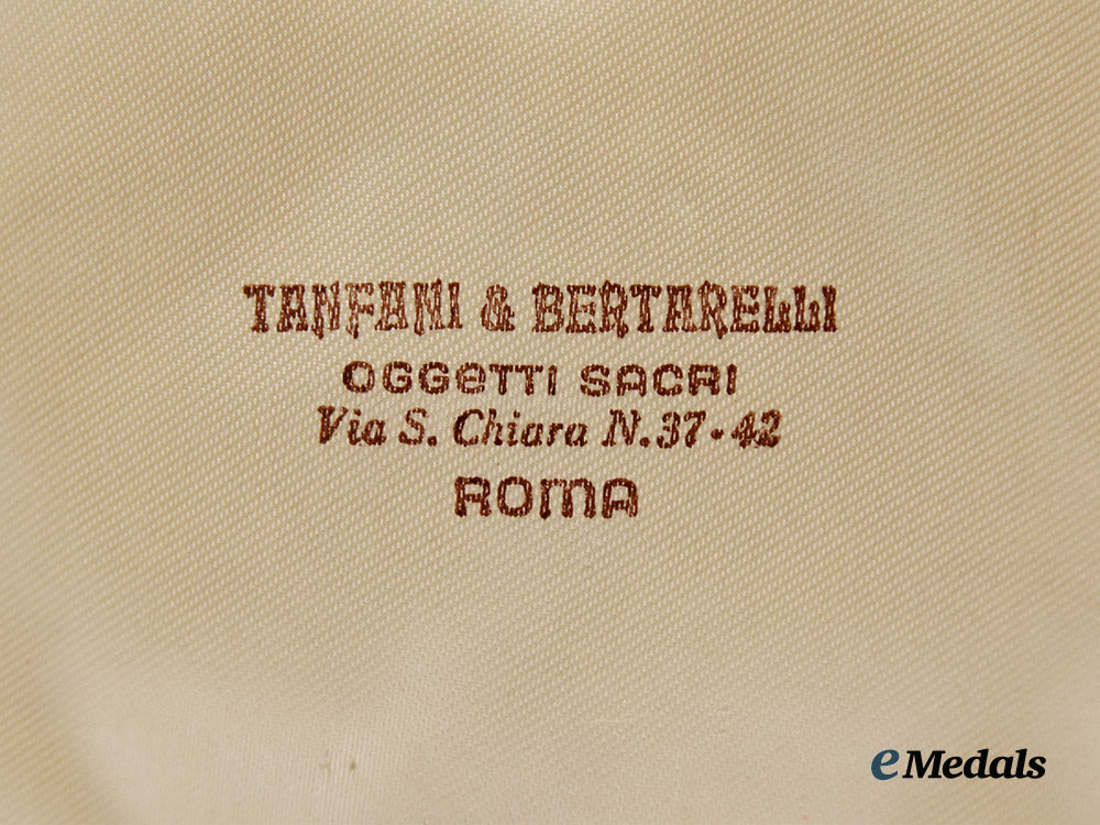 3. Accompanied by a presentation case for the awards, constructed of a lightweight wooden core, with a red faux leather exterior, the exterior of the lid embossed with a Jerusalem Cross in gilt, the interior of the lid lined with off-white silk, embossed with “Tanfani & Bertarelli, Oggetti Sacri, Roma” in gilt lettering, with a space for the placement of the ribbon on the base of the case, with a recessed medal bed for the award, functional exterior metal hinge with intact interior fabric hinge cover, measuring 125 mm (w) x 254 mm (l), in extremely fine condition.