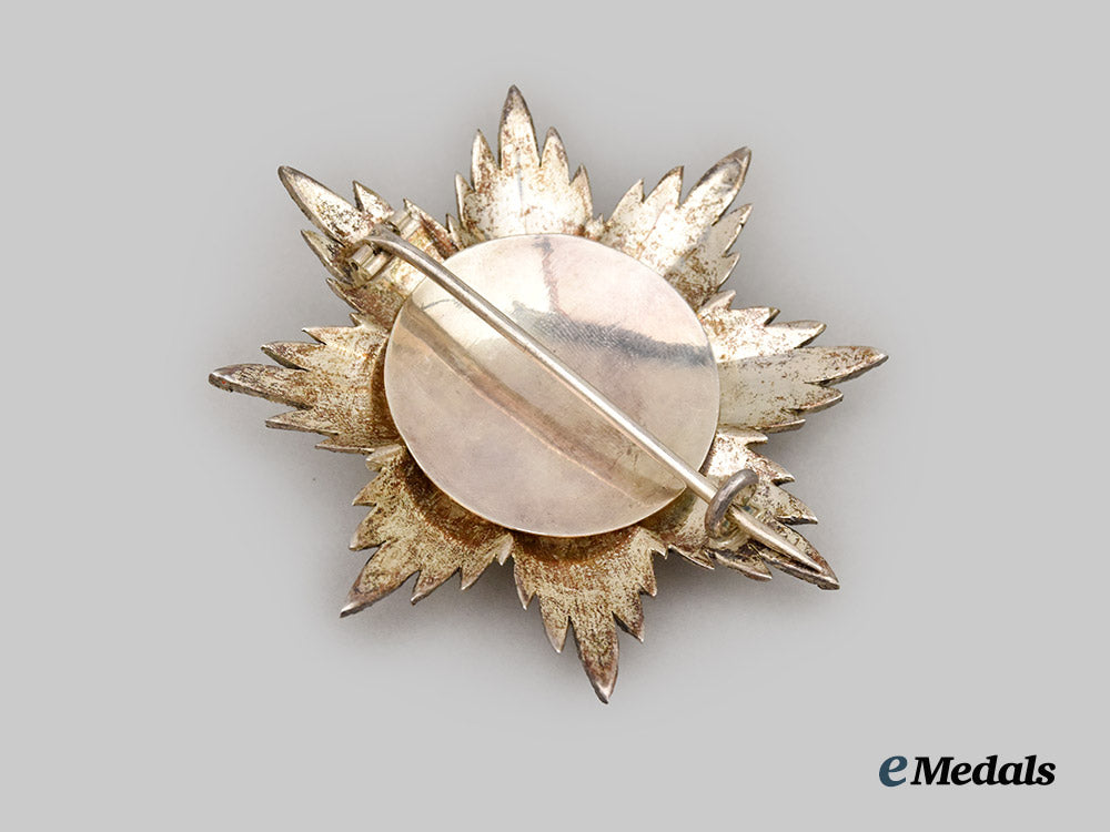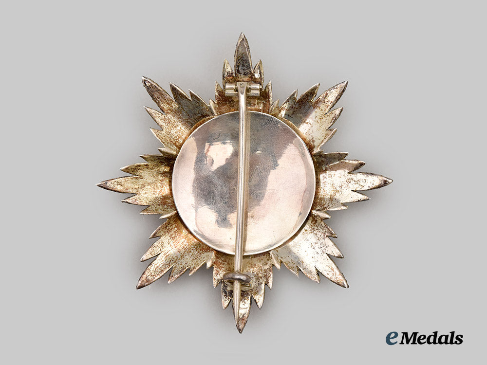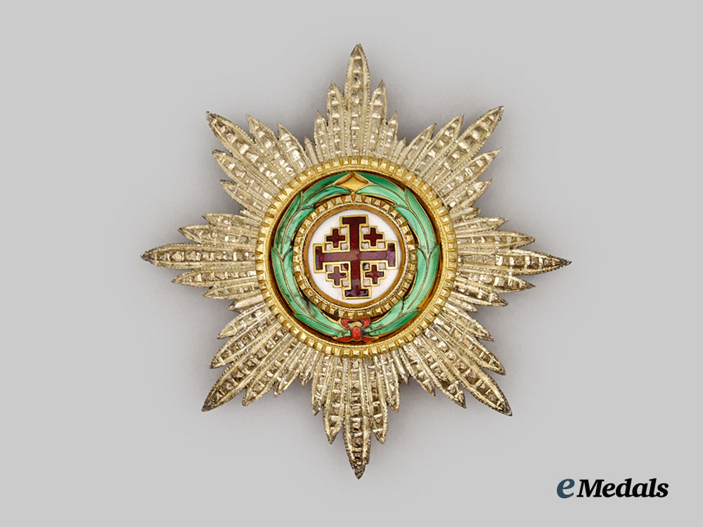1. A breast star, consisting of an eight-pointed silver star with multiple quills between the arms of the star, the obverse centerpiece bears the Jerusalem Cross in red enamels on a white circular background, surrounded by a green enameled laurel wreath tied together at the base by a bright red enameled bow, surrounded by a notched silver gilt bezel, the reverse plain, with a block hinge, a pointed vertical pinback, and a broad wire catch, unmarked, measuring 86.4 mm (w) x 87.3 mm (l), weighing 87.06 grams, fine enameled details with pleasant supple patina, in extremely fine condition.