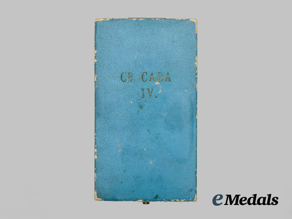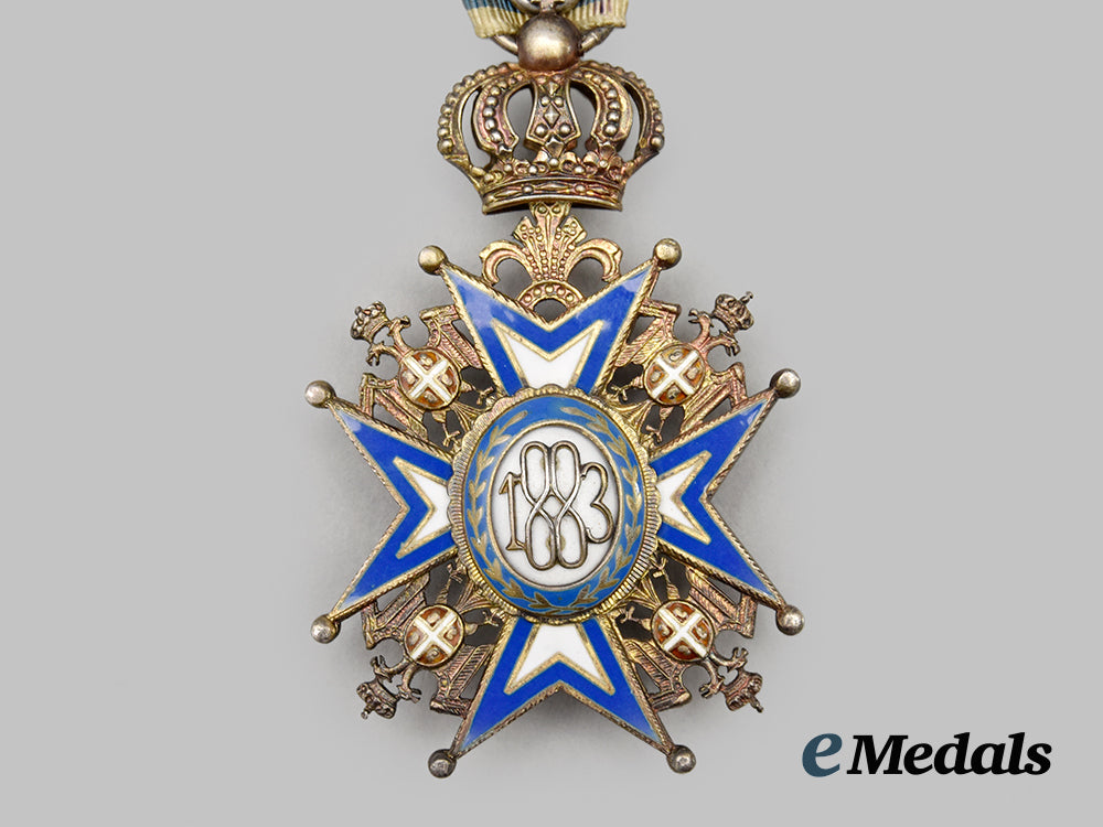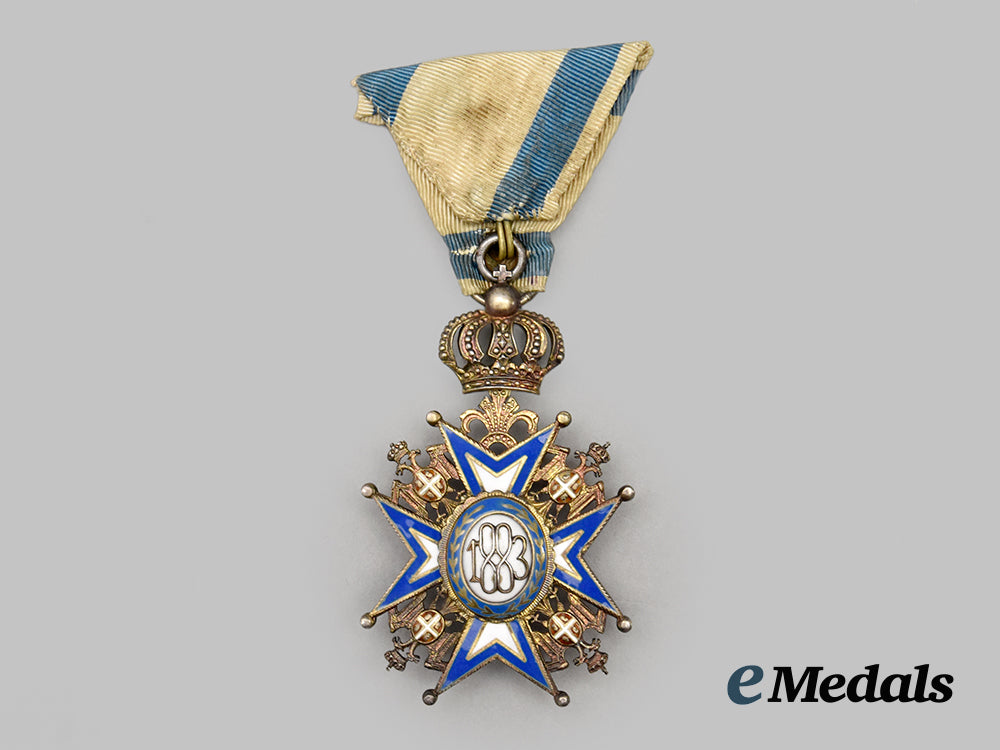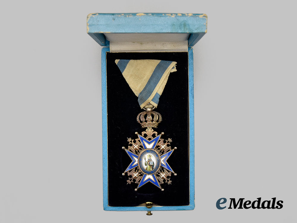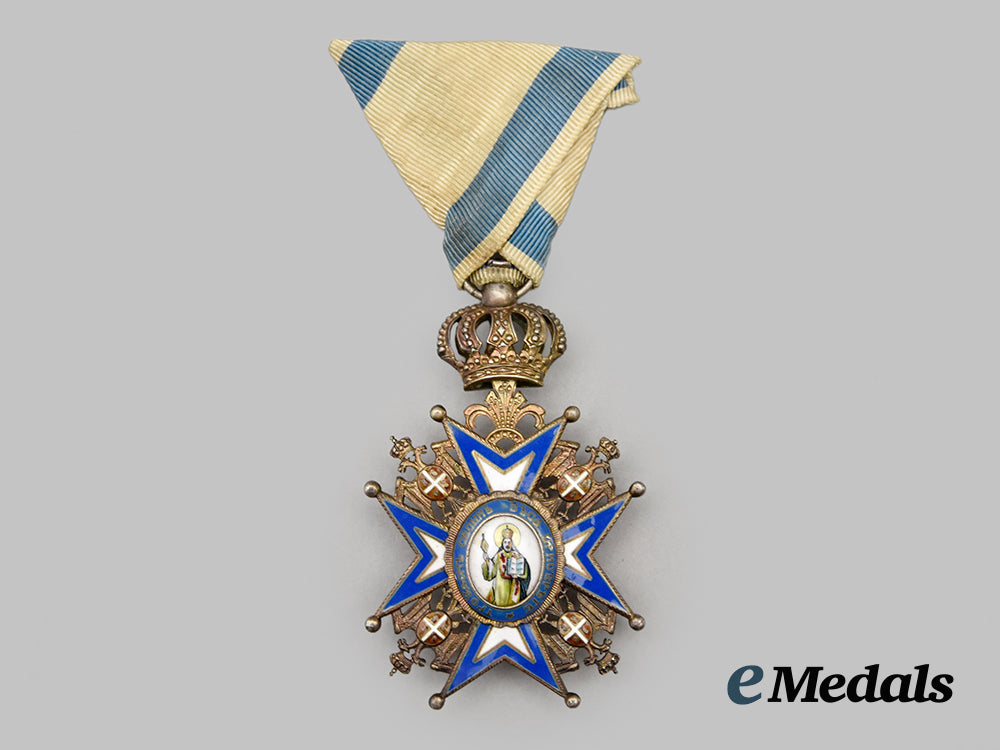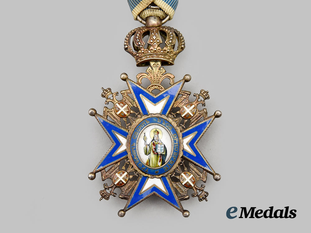 (Orden Svetog Save). Instituted in 1883. Saint in Green Robes. III Model (1921-1941). In silver gilt with blue, white and red enamels, gilt centrepiece rings, painted obverse centrepiece, dated "1883" on the reverse, measuring 41 mm (w) x 67 mm (h) inclusive of its crown and laterally-pierced ball suspension, intact enamels, light soiled original triangular ribbon with hook and eye, extremely fine. In its hardshelled case of issue, marked "CB. CABA IV." (St. Sava IV Class) on the lid, inside lid in white cloth, padded and maker marked "KOVNICA SORLINI VARAŽDIN" in Croatian, base with a recessed medal bed in black felt, measuring 69.5 mm (w) x 123.5 mm (h) x 22.5 mm (d), extensive scuffing evident on the exterior, case near fine.