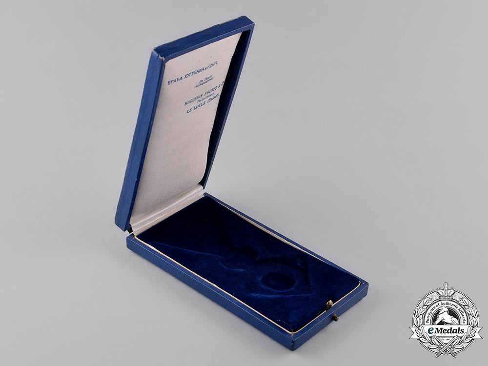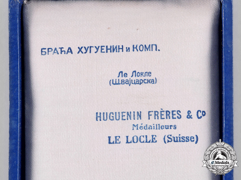 Orden Jugoslavenske krune. Instituted in 1930. Hardshelled, with a navy blue exterior, marked "JUGOSLOVENSKA KRUNA V." (Yugoslav Crown 5th Class) on the lid, maker marked "HUGUENIN FRERES & CO. MEDAILLEURS LE LOCLE (SUISSE)" on the inside lid, navy blue velvet recessed medal bed, hinged, push release, measuring 67.5 mm (w) x 126.2 mm (h) x 23.7 mm (h), lightly scuffed and soiled on the exterior, wear evident on the fabric overlying the hinged area, fine.
