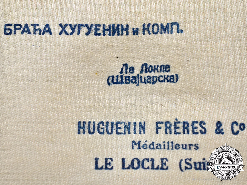 (Orden Jugoslavenske krune). Instituted in 1930, Discontinued in 1945. Multi-piece construction, in silver gilt with red, white, green, light blue and dark blue enamels, unmarked, measuring 42.7 mm (w) x 58.7 mm (h) inclusive of its wreath and laterally-pierced ball suspension, repair evident in the white enamels on a single ray at 12 o'clock on both sides, otherwise, the enamels are intact, original triangular ribbon with hook and eye, near extremely fine. In its hardshelled case of issue, the lid marked in gold-coloured ink "JUGOSLOVENSKA KRUNA V." (Yugoslav Crown V Class), inside lid in white cloth, padded and maker marked "HUGUENIN FRERES & Co Médailleurs LE LOCLE (Suisse)" in French and Serbian, base with a recessed medal bed in black felt, measuring 68.5 mm (w) x 126 mm (h) x 24 mm (d), scuffing and wear evident on the exterior, case near very fine.