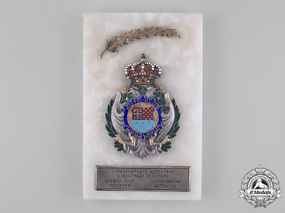 Yugoslavia, Kingdom. Award Plaque For The First International Auto-Race, Belgrade 1939