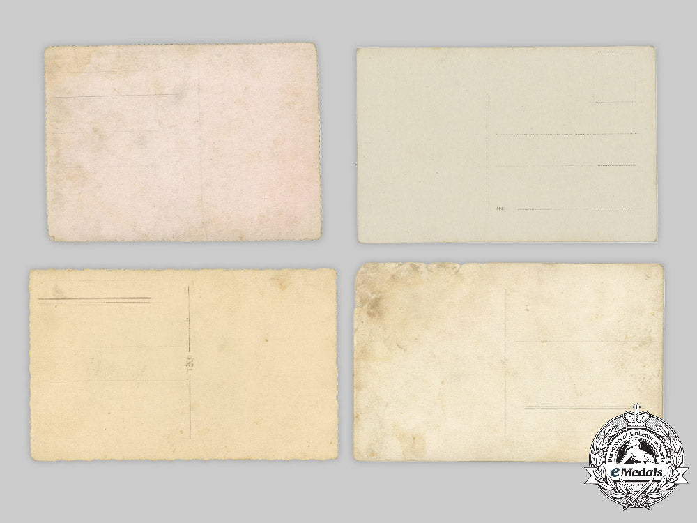 Three photos illustrate small groups of soldiers, while the other photo features a howitzer with one soldier beside it. All are in black and white, two with a matte finish, two with a semi-gloss finish, all with postcard style backers, two with a scalloped border, the other two with straight edges, varying in size from 117 mm (w) x 83 mm (h) to 140 mm (w) x 90 mm (h), one of which exhibits extensive soiling and fraying, the other free of major flaws, ranging from poor to near extremely fine.