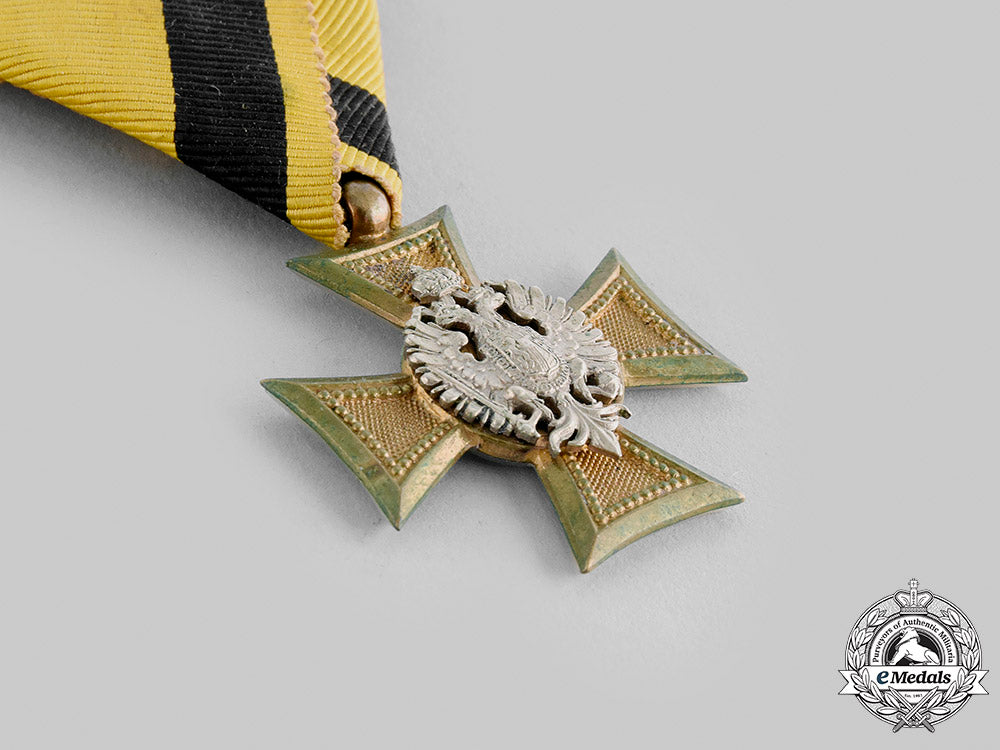 (For 25 Years With Silver Eagle). Instituted 1849. A four-armed cross with pebbled arms in bronze gilt, the obverse centre is superposed by a silvered heraldic symbol of double-headed eagle, plain reverse is backed by unofficial mother of pearl for Officers, measuring 33.32 mm (w) x 37.96 mm (h - inclusive of integral ball), suspended by original triangular breast ribbon with hook and eye, presenting general oxidation across the arms, good condition.
