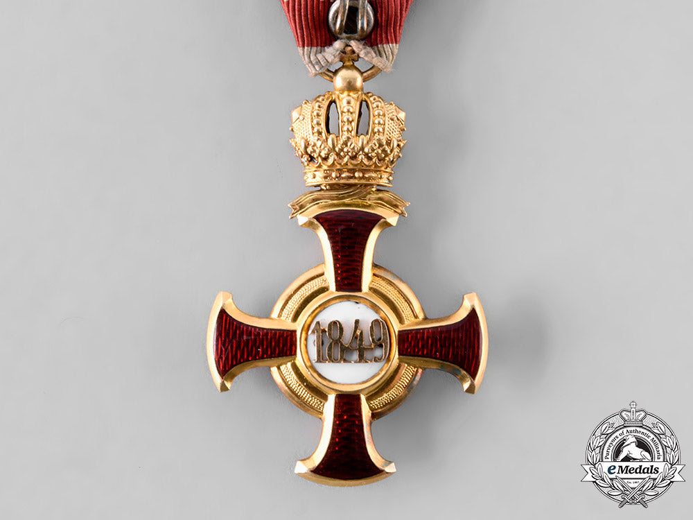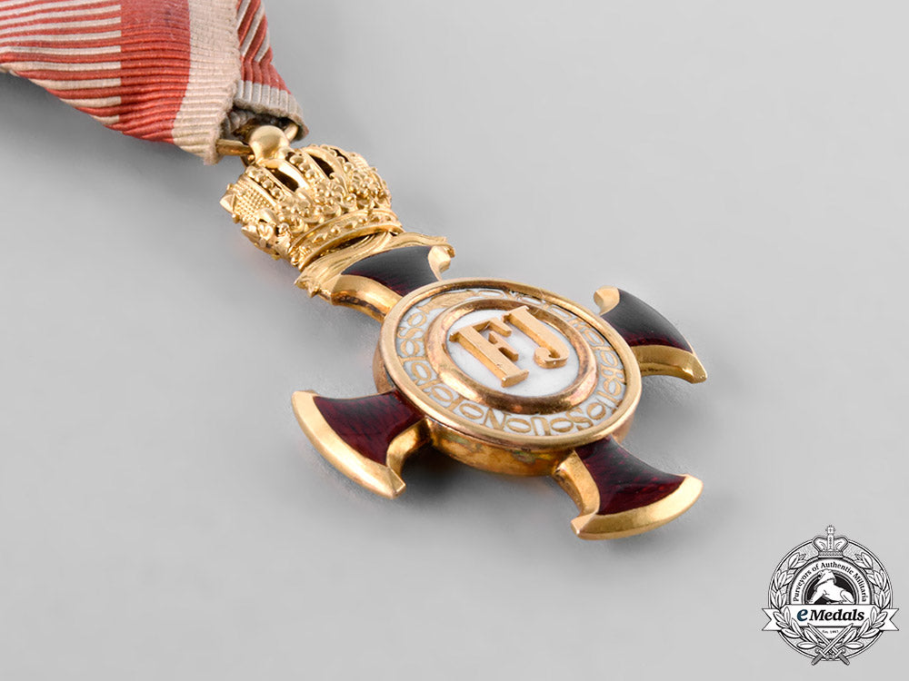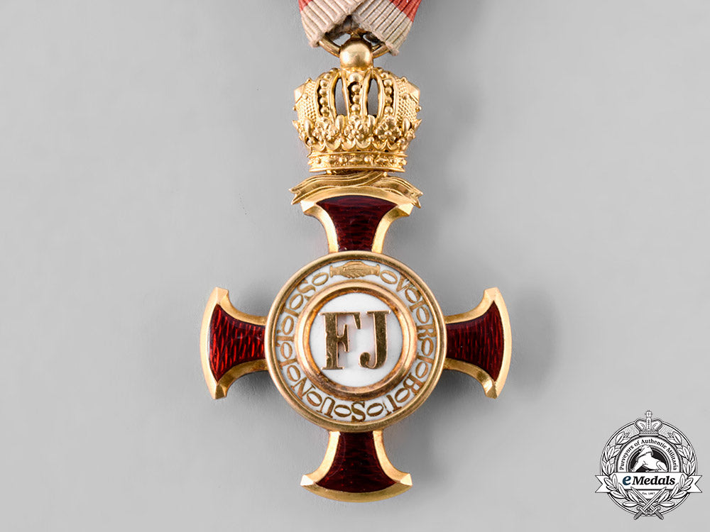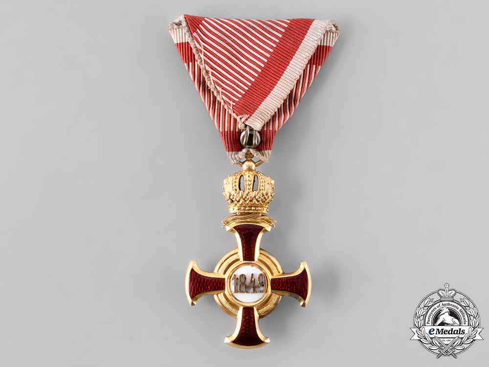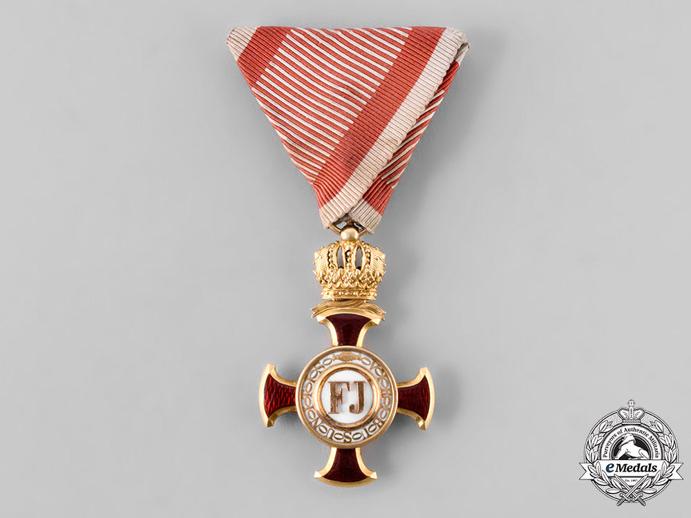 (Goldenes Verdienstkreuz mit Etui). Instituted December 2, 1849 by Emperor Franz Joseph. An 18kt Gold (tested) cross pattee with red enamelled arms, the center obverse presenting a “FJ” on a white enamel field within a Gold border, surrounded by the inscription VIRIBUS UNITIS (Strength Through Unity), the reverse presents 1849 in Gold on a white enamel field, in a Gold lightly pebbled border, surmounted by a delicate crown, measures 35.63mm (w) x 55.66mm (h – inclusive of surmounting crown and cross adorned integral ball), weighs 14.9 grams (without ribbon), maker marked on suspension ring denoting “V. Mayers Sohne” and “in Wien”, with the “Gemsenkopf 3A” hallmark denoting 18kt Gold, worn on an original military triangular ribbon, obverse centerpiece slightly loose, enamels intact, light contact wear, near extremely fine condition.