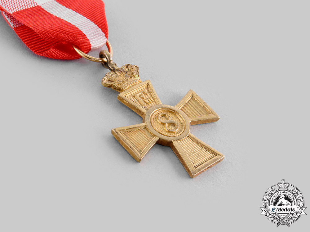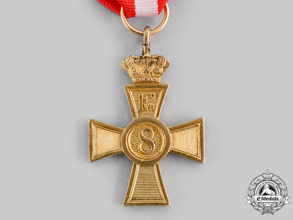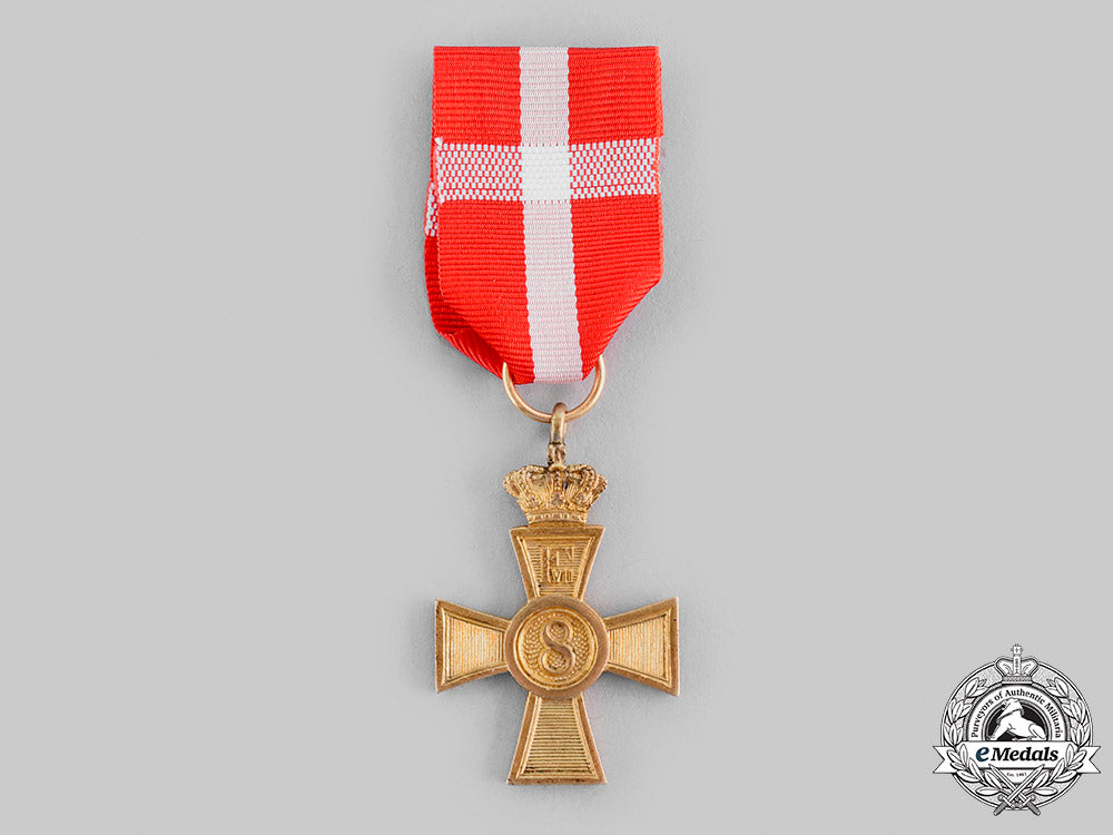 (King Frederik VII For 8 Years). A crowned four-armed cross with striped arms in silver gilt, the 12 o’clock arm depicts the royal cypher of King Frederik VII, the obverse centre with engraved number 8, for time of services, on a pebbled background, the reverse is plain, measuring 29.10 mm (w) x 45.53 mm (h - inclusive of integral ring), suspended by original breast ribbon, presenting light contact, otherwise in extremely good condition.