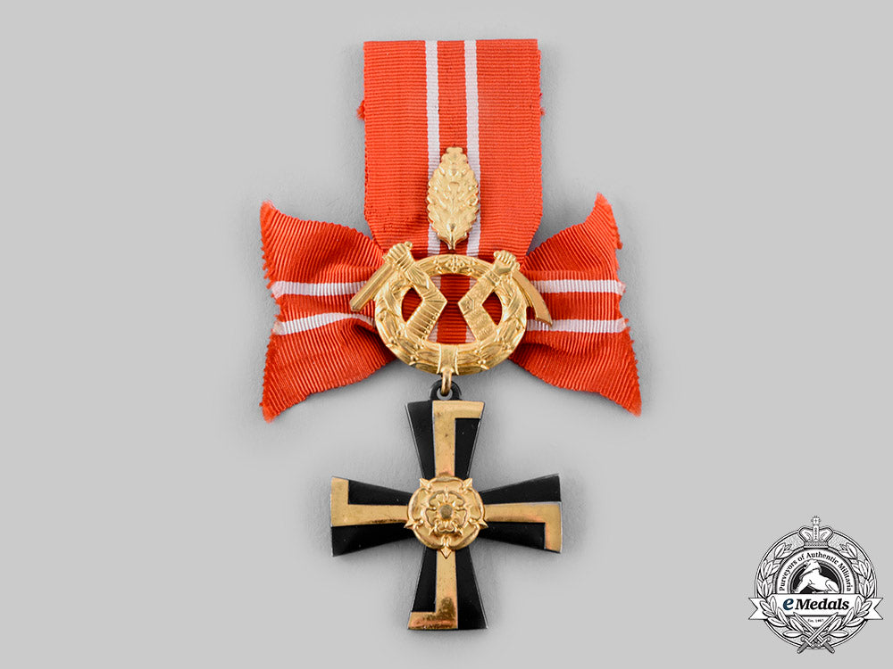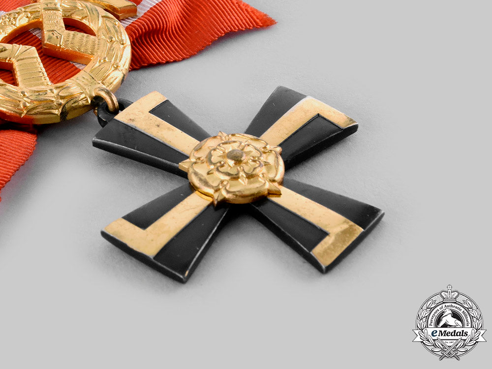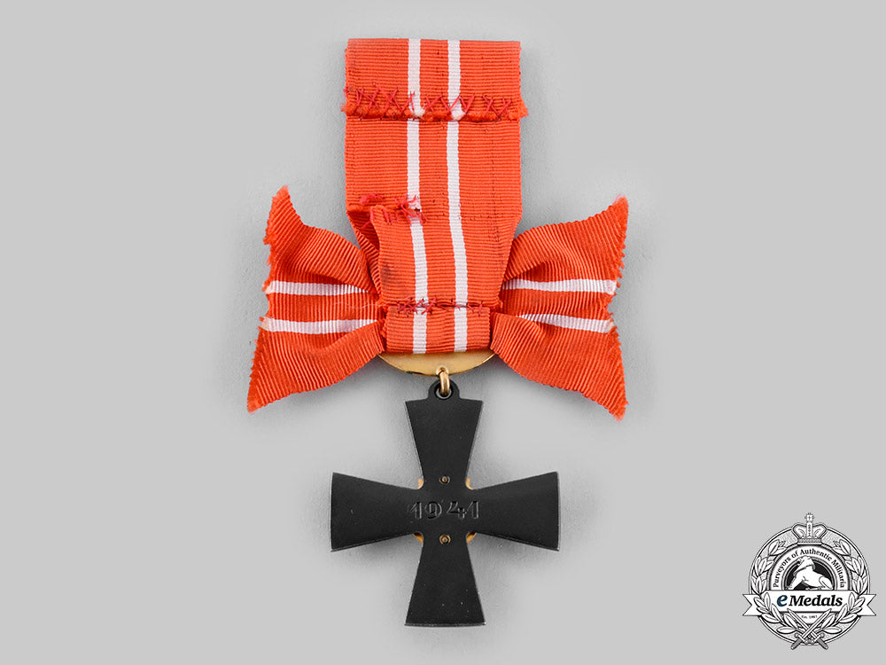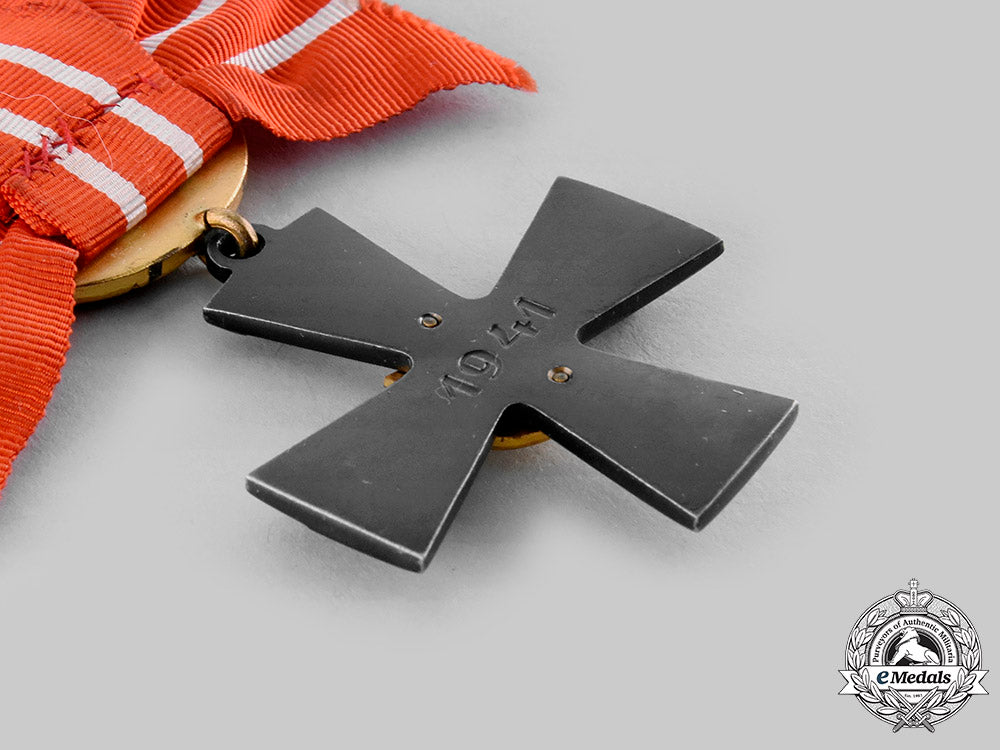 (Vapaudenristin ritarikunta). Instituted in 1918. In gilt and blackened iron, magnetic, dated "1941" on the reverse, measuring 39 mm (w) x 65 mm (h) inclusive of its trophy of arms suspension, light contact evident on the gilt on the arms, original ribbon, near extremely fine.
