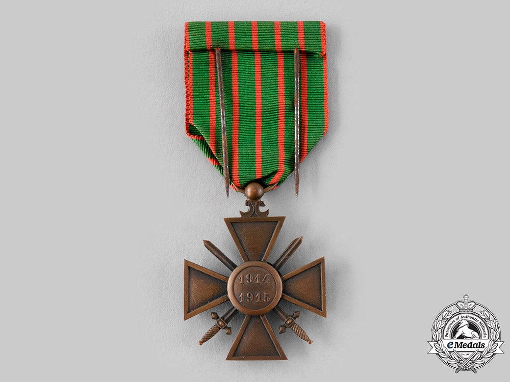 (Croix de Guerre). Instituted in 1915. In bronze, dated "1914-1915" on the reverse centrepiece, measuring 36.5 mm (w) x 45.5 mm (h) inclusive of its laterally-pieced ball suspension, bronze palm on its original ribbon with dual prong pinback, extremely fine.