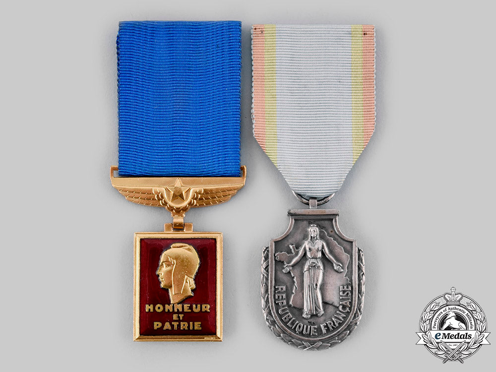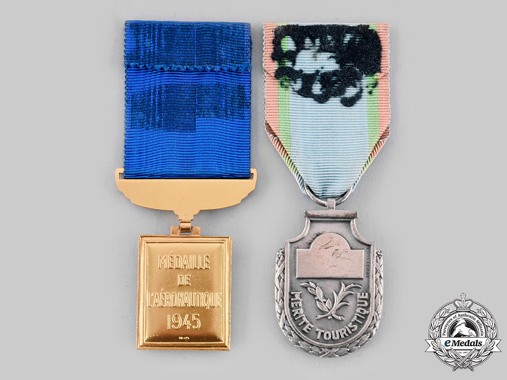 Aeronautical Medal (Médaille de l'Aéronautique). Instituted in 1945 (in bronze gilt with red enamels, measuring 26.8 mm (w) x 35.5 mm (h) inclusive of its integral suspension, intact enamels, original ribbon); and Order of Merit for Tourism, III Class Knight (Ordre du Mérite Touristique, Chevalier). Instituted in 1949 (in silvered bronze, cornucopia hallmarked and marked "BR" (bronze) on the edge, engraver marked "POILLERAT" on the reverse, measuring 31.2 mm (w) x 42.3 mm (h), contact marks on the reverse, original ribbon). Extremely fine and better than very fine, respectively.