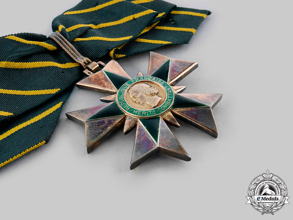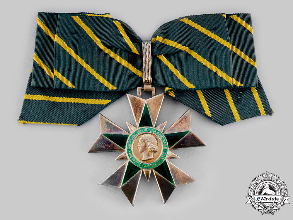 (Ordre du Mérite Combattant). Instituted in 1953. Three-piece construction, in silver gilt with green enamels, engraver marked just below the bust on the obverse, maker marked "AB" (Arthus Bertrand) on the obverse of the integral suspension, measuring 58.8 mm (w) x 58.3 mm (h) inclusive of its integral suspension, intact enamels, very light contact, on its original full-length neck ribbon which has been folded and sewn together to form a bow-tied look, near extremely fine.