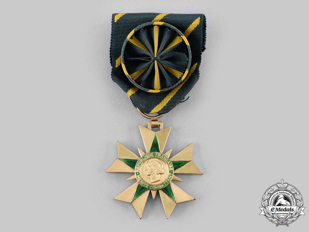 (Ordre du Mérite Combattant). Instituted in 1953. Three-piece construction, in bronze gilt with green enamels, engraver marked just below the bust on the obverse, measuring 40 mm (w) x 40.5 mm (h) inclusive of its integral suspension, intact enamels, very light contact, large rosette on its original ribbon, near extremely fine.
