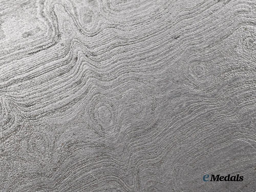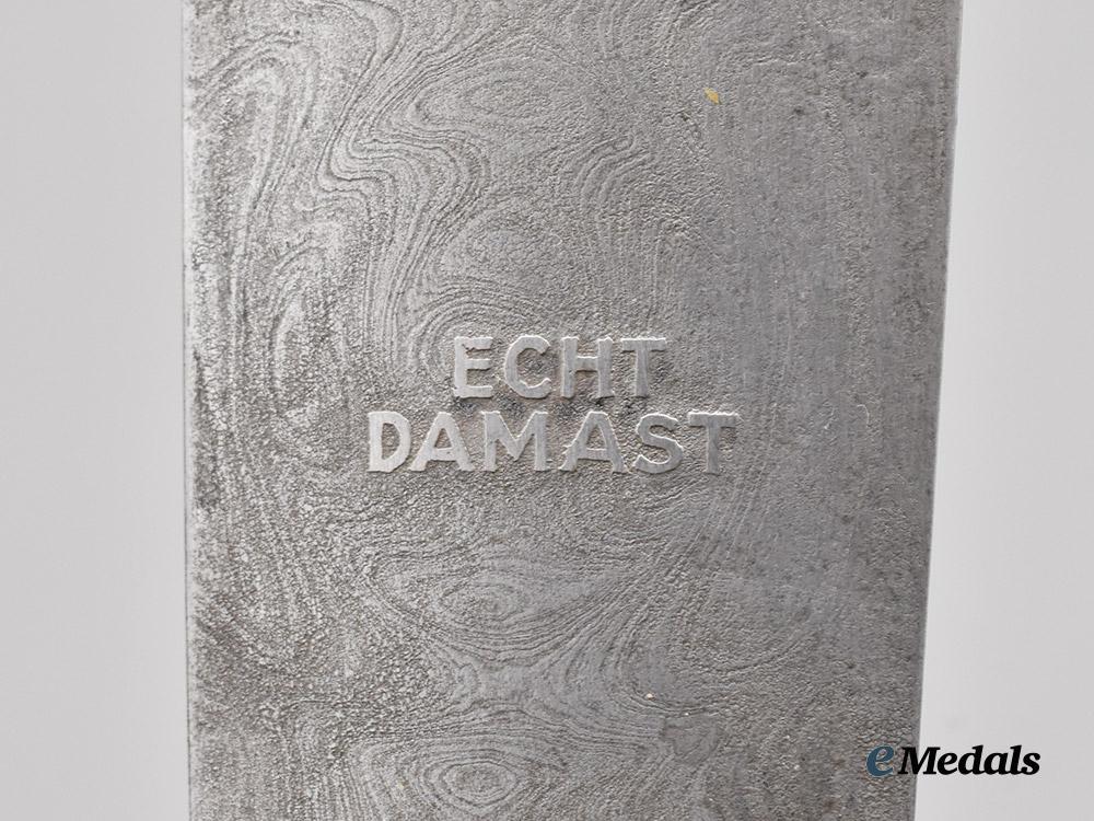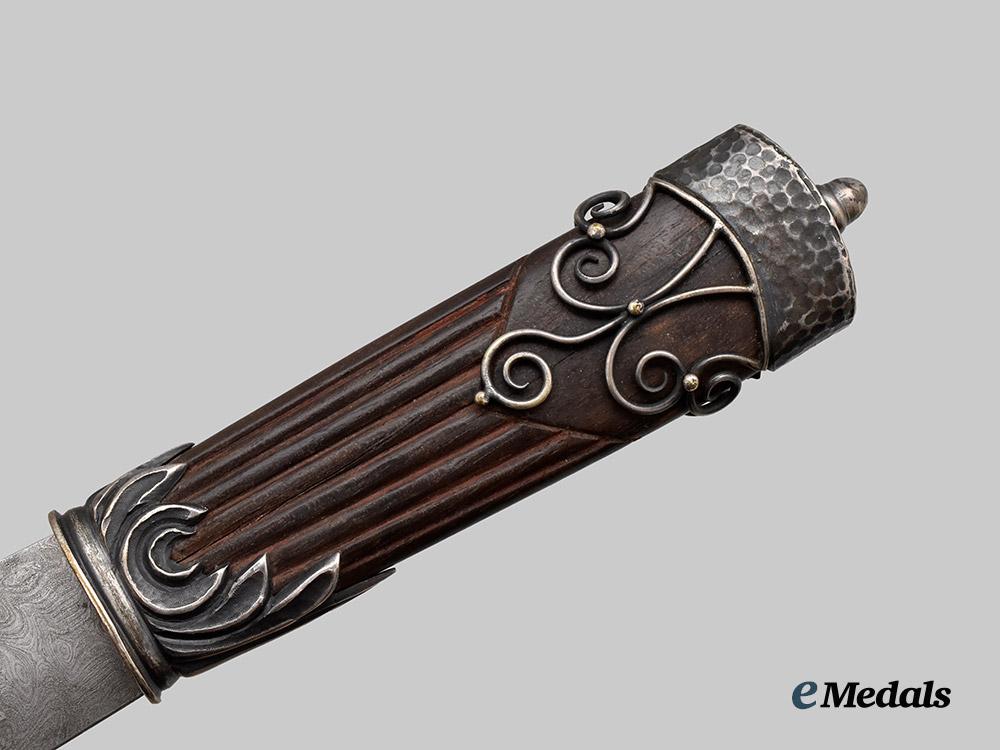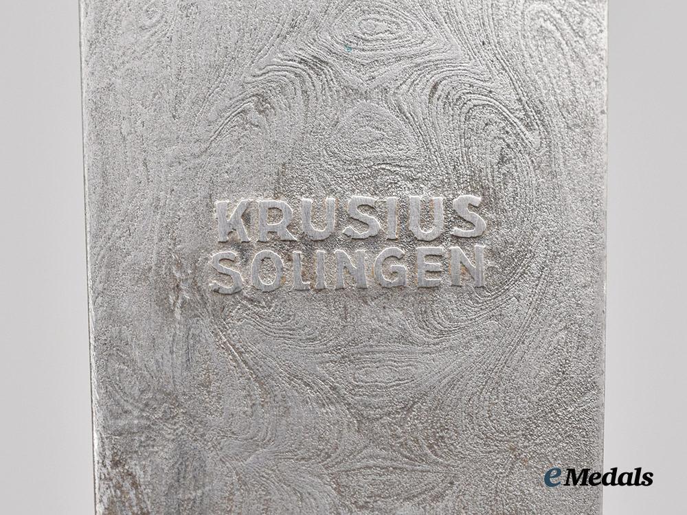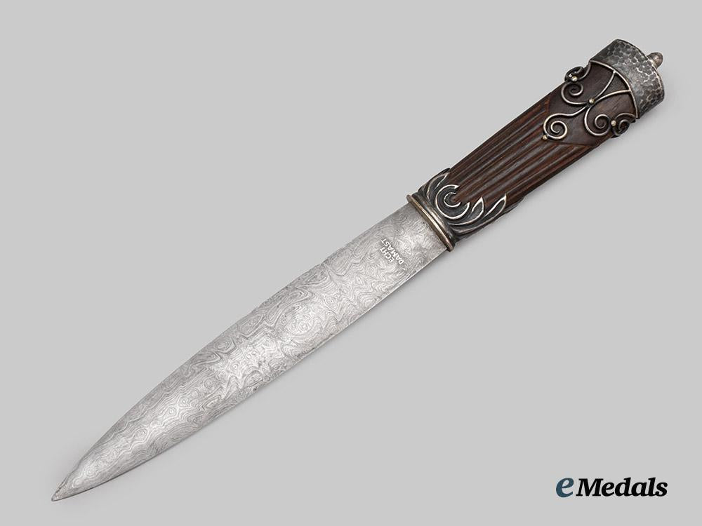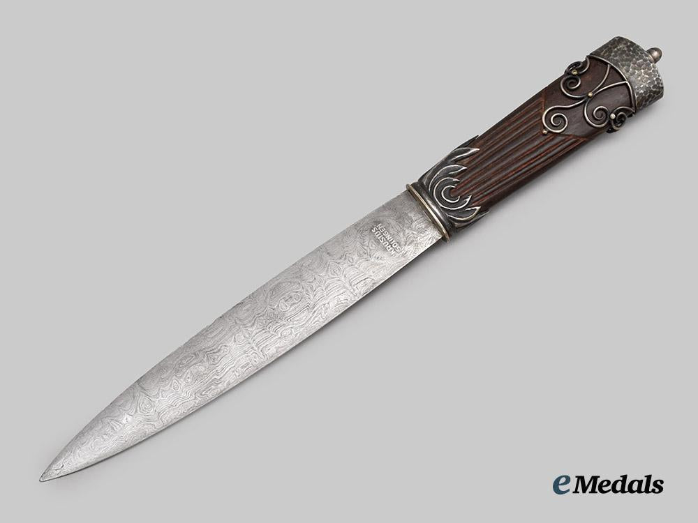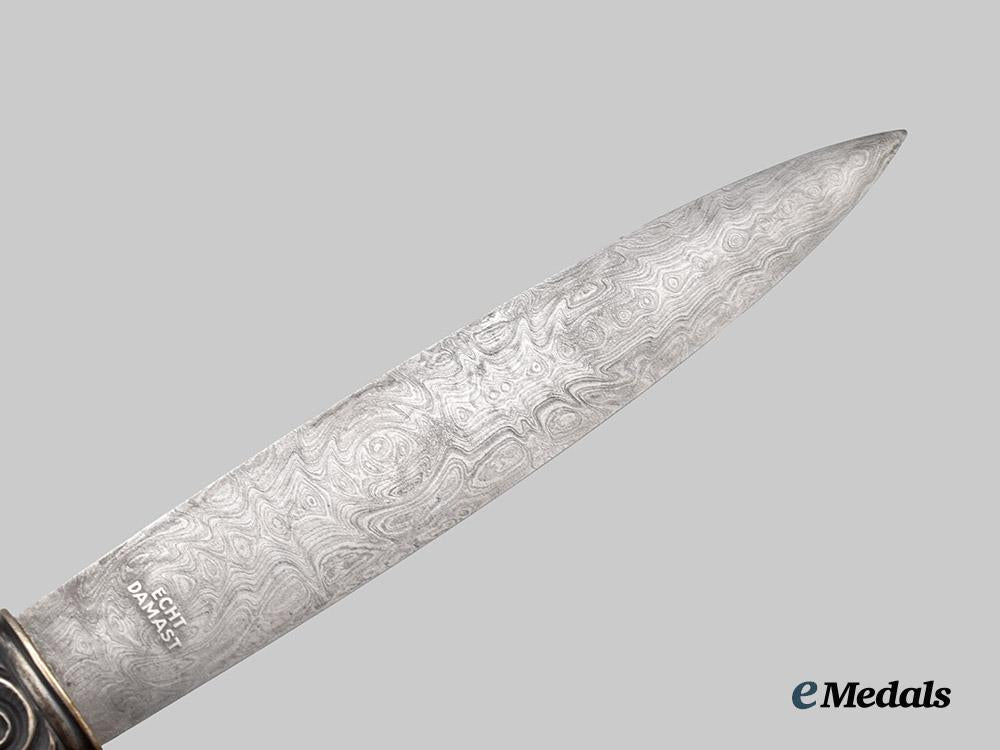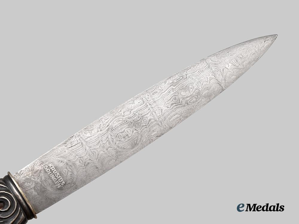 (Damast Messer). A unique and ornate Damascus steel knife, measuring 270 mm in total length. It features a 162 mm-long Damascus steel blade, bearing obverse and reverse ricasso inscriptions. One reads “ECHT DAMAST”, indicating genuine Damascus steel, while the opposite bears a maker’s mark of “KRUSIUS, SOLINGEN, for the firm of Gebrüder Krusius. The blade sits securely within a polished dark wooden handle with dual-sided ribbing. Intricate silver fittings adorn both ends of the handle, with the pommel retaining a rounded nut. The pommel nut’s threading has been stripped, with the fixture consequently loosening from the handle. An additional crack is visible to one side of the handle grip. This unique and rare knife is in an overall better than very fine condition.