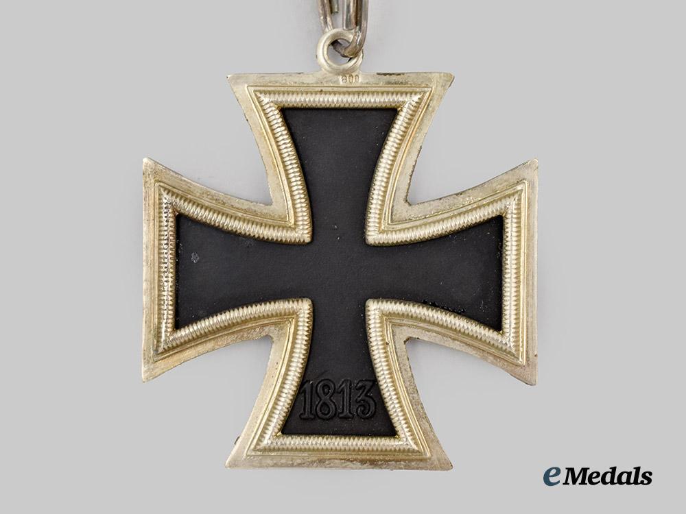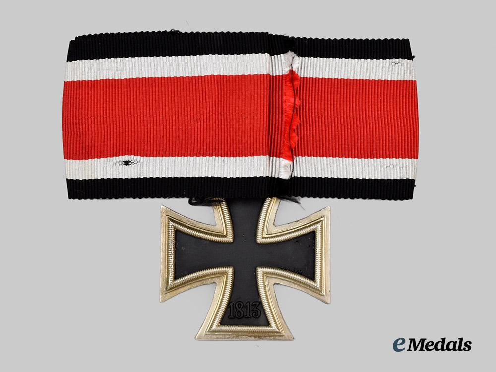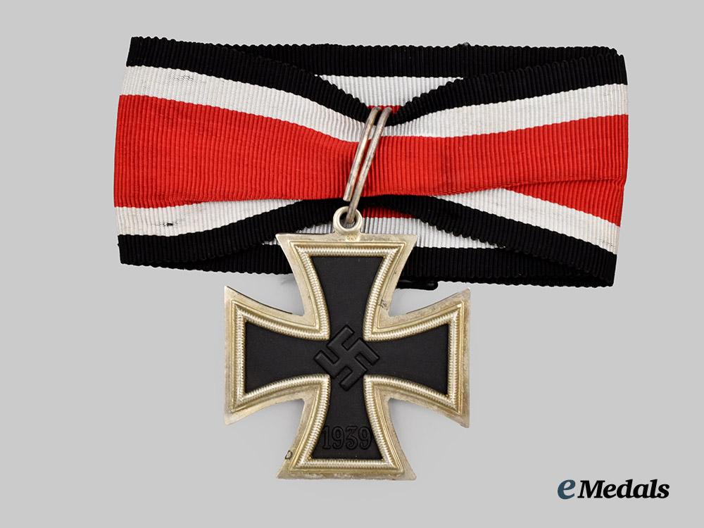 (Ritterkreuz des Eisernes Kreuzes, Museumsstück). Constructed of iron and silver, consisting of a Cross Pattée with a blackened magnetic iron core within a ribbed silver frame, the obverse with a central initial “W”, the six o’clock arm with a reinstitution date of “1939”, the reverse arm with an initial institution date of “1813”, the twelve o’clock arm topped by an integral loop and suspension ring retaining a period original neck ribbon, double-stamped with a silver content number of “800”, unmarked but demonstrating the characteristics of manufacture by Rudolf Souval, Vienna, c. 1965, measuring 49.08 mm (w) x 54.58 mm (h), weighing 20.6 grams (inclusive of ring), a high-quality exhibition example in near mint condition.