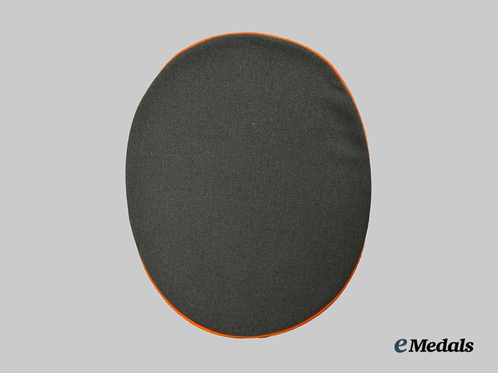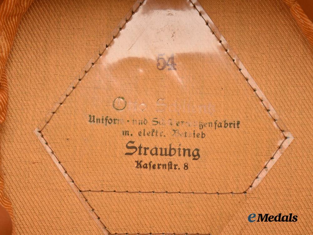 (Heer Schirmmütze für Mannschaften der Feldgendarmerie). An extremely well-preserved Heer Feldgendarmerie EM/NCO’s visor cap, constructed of field-grey wool with a subtle whipcord weave. The cap features reinforced side walls which are lined on the exterior with a dark green wool cap band. Both the top and bottom edges of the band are trimmed with orange piping, while an additional length of identical piping surrounds the outer edge of the crown. Pinned onto the peak is an aluminum Wehrmacht eagle clutching a wreathed mobile swastika, measuring 65 mm (w) x 25 mm (h). Directly below the eagle, the centre of the cap band is pinned with an aluminum tri-colour cockade and wreath, measuring 65 mm (w) x 45 mm (h) overall. The lower edge of the cap band is flanked by black magnetic metal studs which retain a multi-piece black leather chinstrap, itself adjusted with dual black magnetic metal buckles. A protruding vulcanfibre visor completes the exterior features, and is finished in black on the obverse and in brown on the reverse. The interior is encompassed by a multi-piece light brown rayon liner, while a wide brown leather sweatband surrounds the walls, and is perforated across the forehead with ventilation holes. The crown retains an intact transparent plastic rhomboid moisture guard which bears a maker’s mark of “OTTO SCHLIENTZ, STRAUBING” and a size mark of “54”. An additional maker or distributor mark of “GUSTAV ENDRISS, SOPFINGEN” is stamped onto the reverse of the sweatband. The cap measures approximately 23 cm (w) x 26.5 cm (l) x 16 cm (h). Demonstrating only minor material fatigue, it remains in an extremely fine condition.